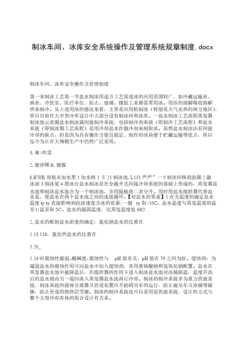 10、加水器:它是把自来水或预冷后的制冰水加注到冰桶的装置。是将一排冰桶同时注满同等数量的水,是一个长方形容器,加水器由与冰桶数相应的旋转水嘴、定量水箱组成,容器内根据框内的冰桶数目用隔板分成格,以确保向各个冰桶中同时等量加水。加水器内每个格的容量为一个冰桶容积的90、吹气装置:吹起装置是用于制取透明冰的专用设备,主要包括罗茨风机、空气罐及输送管道。在制取透明冰时,罗茨风机将压缩后的高压气体存贮在空气罐里,通过送气管道送入冰桶中,以排除制冰水中溶入的空气,达到制取透明冰的目的。12、滑冰台:滑冰台为具有漏水缝并带有一定坡度的木板台,用于接收倒冰架倒出的冰块,并由此滑入贮冰间。滑冰台应有2%4的坡度,靠近墙处应有反向坡度,以免冰块接近墙体。滑冰台的宽度应大于倒冰架,长度为冰块长度的3倍。制冰间的建筑不同于冷库,建筑物本身一般不需要隔热,而制冰设备则需要隔热设施。如盐水制冰的制冰池,其四周和底部均需设隔热层,顶部要加木盖。管冰机和颗粒冰机的蒸发器也应隔热。片冰机和板冰机的周围应设置隔热板。第三节制冰车间安全操作及管理制度、持证上岗制氨机房岗位操作工及制冰车间上岗人员遵照公司GDJPS-GLZD-20-002安全生产管理制度及规章细则中的第八章特种设备及特种作业人员安全管理制度执行。
