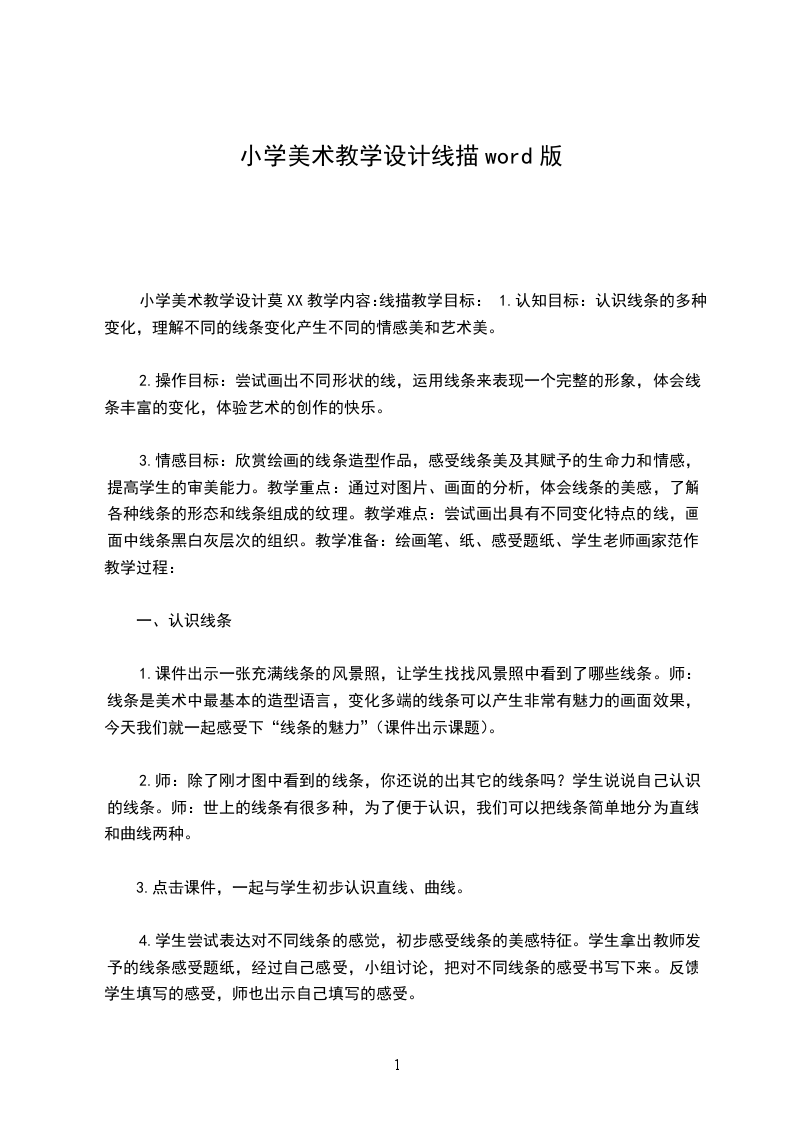 3.情感目标:欣赏绘画的线条造型作品,感受线条美及其赋予的生命力和情感,提高学生的审美能力。教学重点:通过对图片、画面的分析,体会线条的美感,了解各种线条的形态和线条组成的纹理。教学难点:尝试画出具有不同变化特点的线,画面中线条黑白灰层次的组织。教学准备:绘画笔、纸、感受题纸、学生老师画家范作。教学过程:一、认识线条