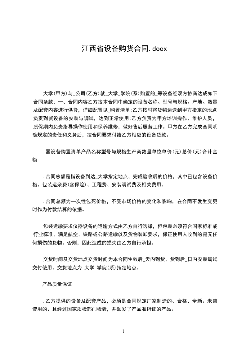 大学(甲方)与_公司(乙方)就_大学_学院(系)购置的_等设备经双方协商达成如下合同条款:一、合同内容乙方按本合同中确定的设备名称、型号与规格、产地、数量及配套内容进行供货,详细配置见_购置清单;乙方按时将货物运送到甲方指定的地点,负责到货设备的安装与调试,达到正常使用;乙方负责为甲方培训操作、维护人员,质保期内负责指导操作使用和保养维修,做好售后服务工作。甲方在乙方完成合同明确规定的责任和义务后,按合同要求付给乙方相应的设备货款。