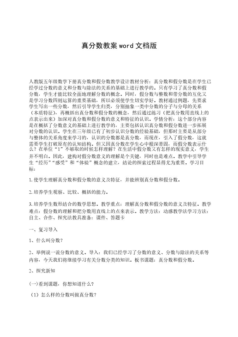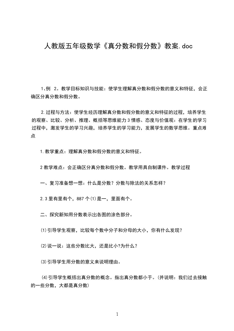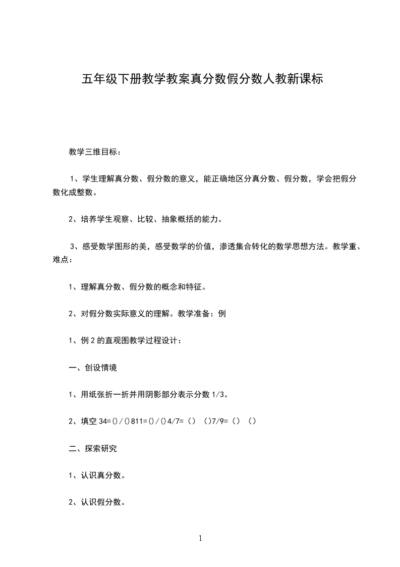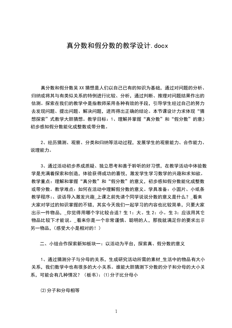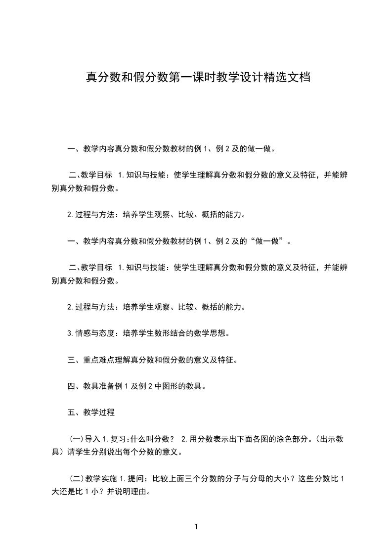 真分数、假分数和带分数教学内容:冀教版数学五年级下册第13-15页。教学目标:过程与方法目标:结合具体图形和分苹果的事例,经历认识真分数、假分数和带分数的过程。知识与技能目标:知道真分数、假分数和带分数的定义,能用假分数和带分数表示涂色图形的面积和计算结果。情感态度价值观目标:感受假分数和带分数在数学学习和现实问题中的价值,增强学习新知识的兴趣。课前准备:圆片、小黑板、小刀教学重点:理解真分数、假分数和带分数的实际意义,能用假分数和带分数表示涂色图形的面积和计算结果。教学难点:理解用假分数表示图中涂色部分的面积以及带分数的实际意义。教学方案:教学环节教学预设设计意图