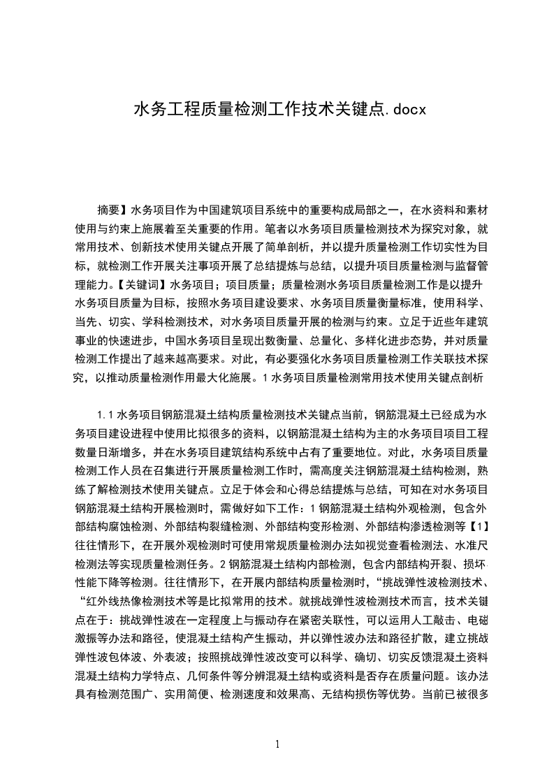 摘要】水务项目作为中国建筑项目系统中的重要构成局部之一,在水资料和素材使用与约束上施展着至关重要的作用。笔者以水务项目质量检测技术为探究对象,就常用技术、创新技术使用关键点开展了简单剖析,并以提升质量检测工作切实性为目标,就检测工作开展关注事项开展了总结提炼与总结,以提升项目质量检测与监督管理能力。【关键词】水务项目;项目质量;质量检测水务项目质量检测工作是以提升水务项目质量为目标,按照水务项目建设要求、水务项目质量衡量标准,使用科学、当先、切实、学科检测技术,对水务项目质量开展的检测与约束。立足于近些年建筑事业的快速进步,中国水务项目呈现出数衡量、总量化、多样化进步态势,并对质量检测工作提出了越来越高要求。对此,有必要强化水务项目质量检测工作关联技术探究,以推动质量检测作用最大化施展。1水务项目质量检测常用技术使用关键点剖析
