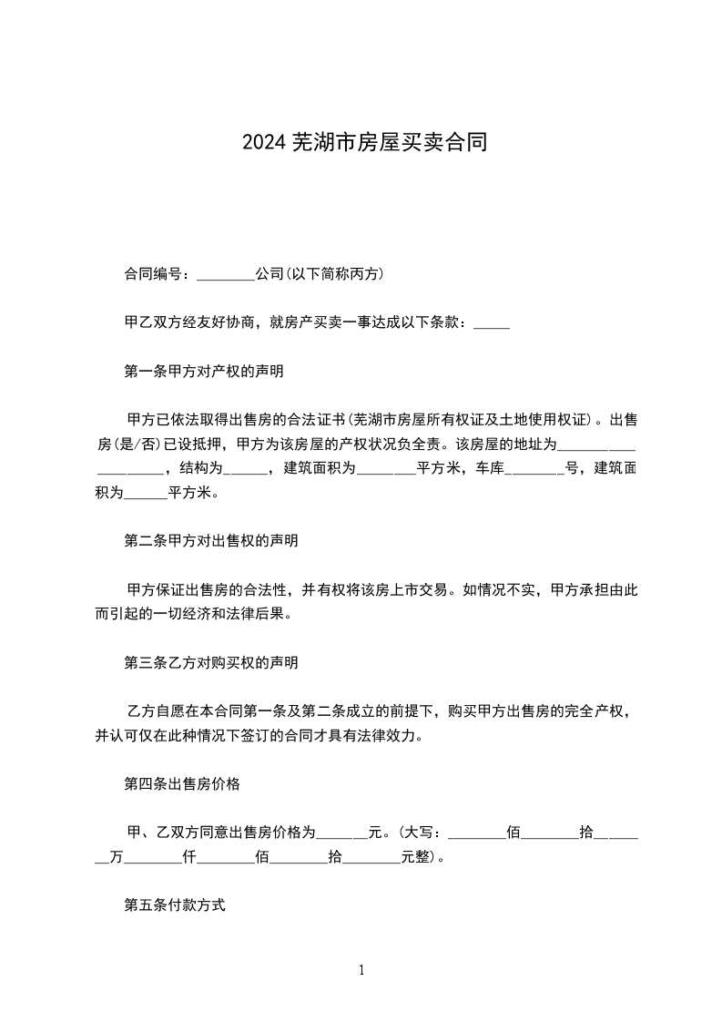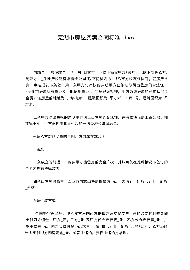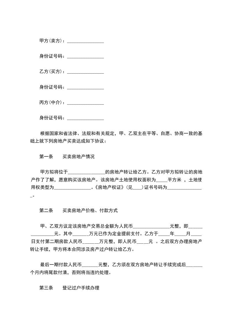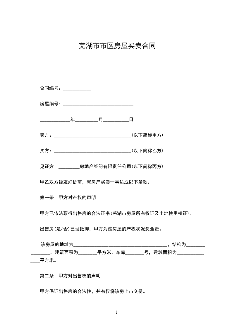同编号:_房屋编号:_年_月_日卖方:_(以下简称甲方)买方:_(以下简称乙方)见证方:_房地产经纪有限责任公司(以下简称丙方)甲乙双方经友好协商,就房产买卖一事达成以下条款:第一条甲方对产权的声明甲方已依法取得出售房的合法证书(芜湖市房屋所有权证及土地使用权证)出售房已设抵押,甲方为该房屋的产权状况负全责。该房屋的地址为_,结构为_,建筑面积为_平方米,车库_号,建筑面积为_平方米。