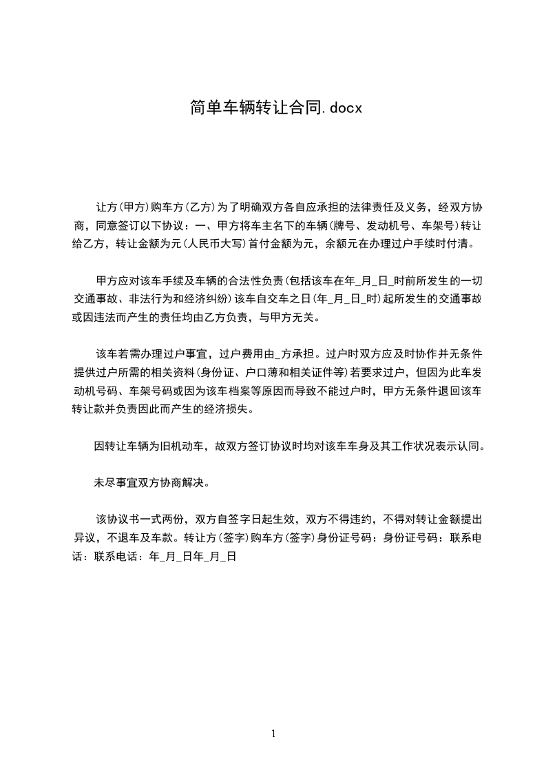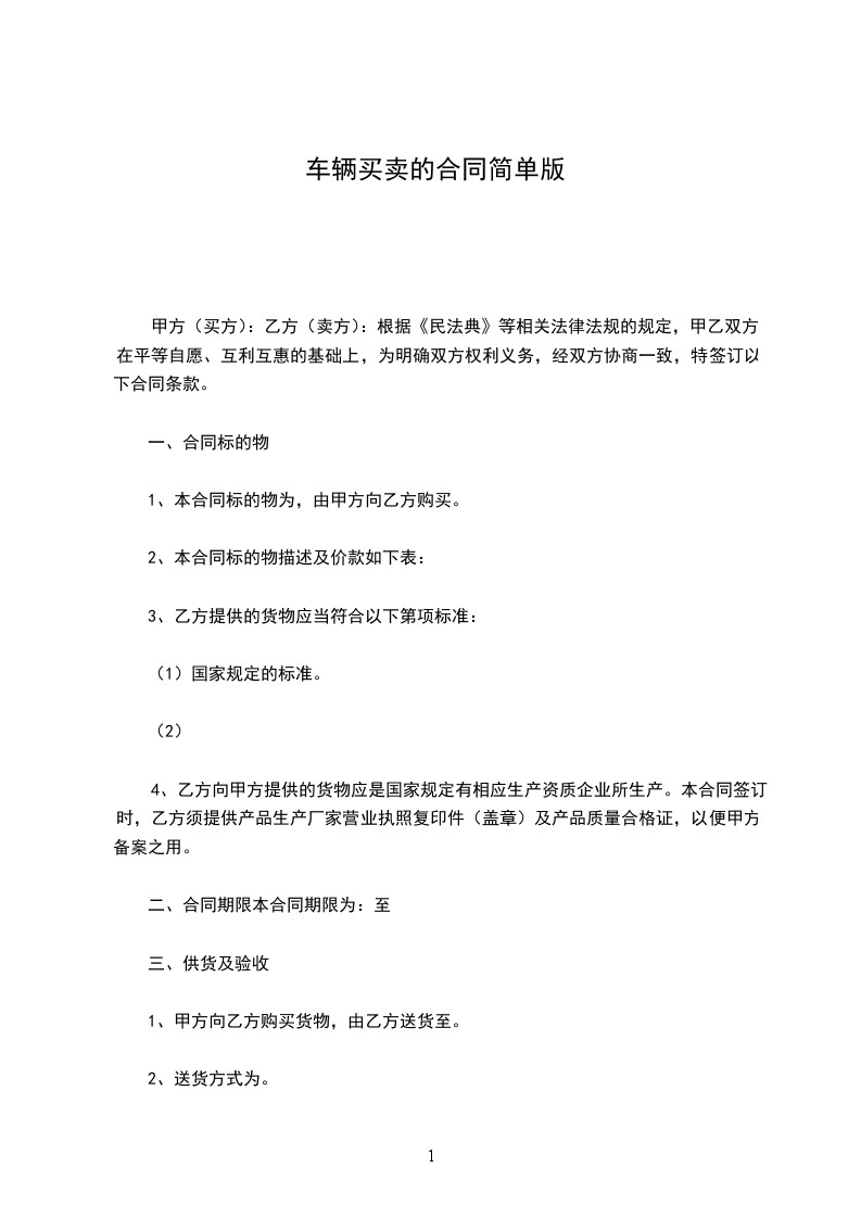 乙双方就车辆买卖事宜达成以下协议,共同遵照执行:第一条甲方购买乙方所有的机动车一辆:车号:_颜色:_产地:_型号:_发动机号码:_(拓印粘贴)底盘号码:_(拓印粘贴)