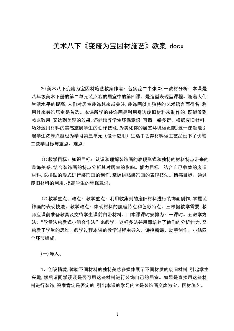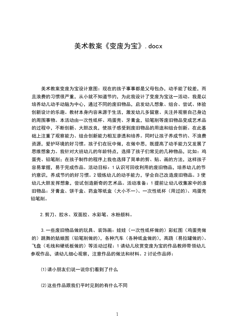 美术教案变废为宝设计意图:现在的孩子事事都是父母包办,动手能了较差,而且浪费的习惯很严重,从小就不知道节约,为此我设计了变废为宝这一活动。我是以培养幼儿动手动脑为中心,通过不同的废旧物品,启发幼儿想象、组合、尝试、体验创新设计的乐趣。教材本身内容来源于生活,激发幼儿多留意、关注并观察自己身边的周围事物。本活动由一次性纸杯、鸡蛋壳、牙膏盒,铅笔削等废旧物品变成艺术品的过程中,不断创新、大胆改良,使孩子感受到废旧物品的用途和组合创新。在此基础上注重了观察能力、组合创新能力相互渗透和培养。同时让孩子养成节约、不浪费资源,爱护环境的好习惯。孩子们在玩中做,在做中思,既提高了动手能力又发展了思维想象力。我针对大班幼儿的年龄特点,选择了孩子们常见的几种物品,比如:鸡蛋壳、铅笔削;在孩子制作的程序上我也选择了简单的剪、贴、画的方法,这样孩子容易掌握,易于完成作品。活动目标:1认识可回收利用的废旧物品,培养幼儿的节约意识,养成节约的好习惯。2锻炼幼儿的动手能力,学会自己改造废旧物品。3使幼儿大胆发挥想象,尝试创造新奇的艺术品。活动准备:1提前让幼儿收集家中的废旧物品:牙膏盒、饼干盒、药盒等纸盒(大小不一)、一次性纸杯(用过的)、鸡蛋壳、铅笔削。