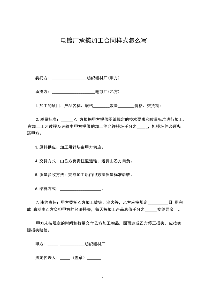 7.违约责任:甲方委托乙方加工镀锌、淬火等,乙方应按规定日期完成;逾期由乙方负担甲方的经济损失,每天按加工产品总值千分之______交纳罚金。甲方未按规定的时间和数量交付乙方加工物品,因而造成乙方停工损失,应按实际损失赔偿。