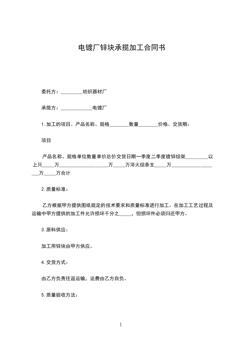 2.质量标准:乙方根据甲方提供图纸规定的技术要求和质量标准进行加工。在加工工艺过程及运输中甲方提供的加工件允许损坏千分之_____,但损坏件必须归还甲方。