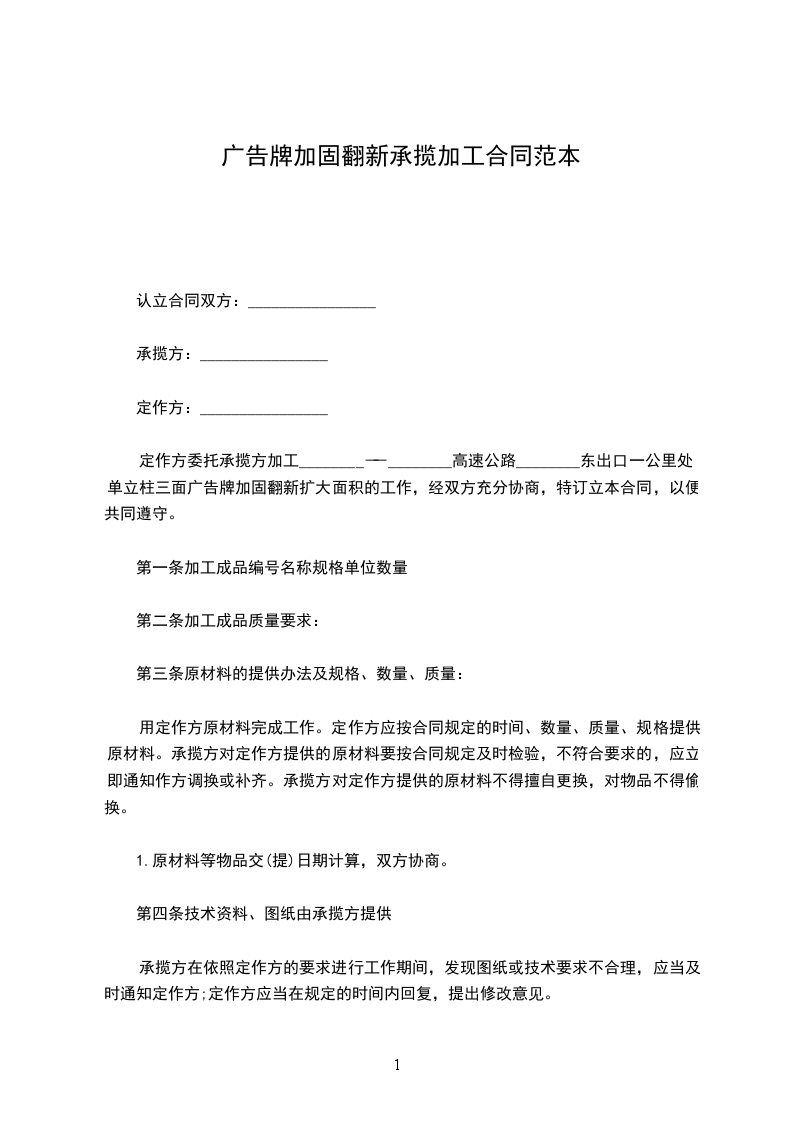 定作方委托承揽方加工________――________高速公路________东出口一公里处单立柱三面广告牌加固翻新扩大面积的工作,经双方充分协商,特订立本合同,以便共同遵守。