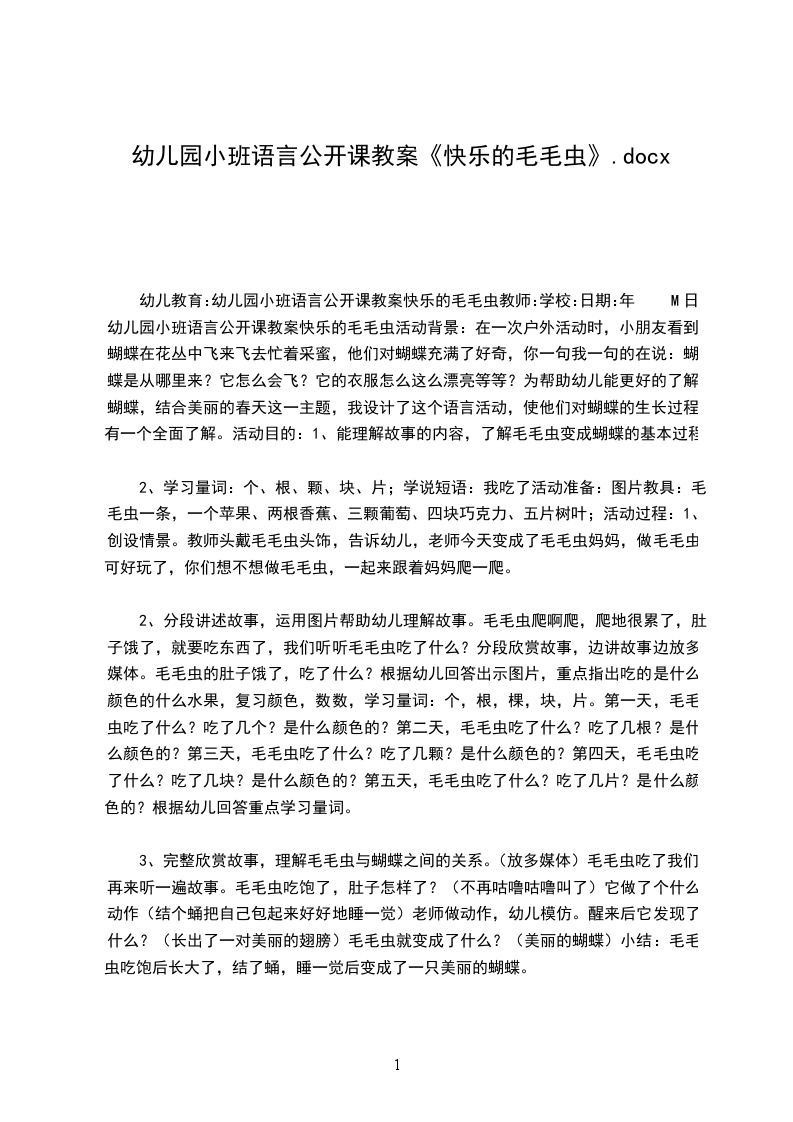 幼儿教育:幼儿园小班语言公开课教案快乐的毛毛虫教师:学校:日期:年M日幼儿园小班语言公开课教案快乐的毛毛虫活动背景:在一次户外活动时,小朋友看到蝴蝶在花丛中飞来飞去忙着采蜜,他们对蝴蝶充满了好奇,你一句我一句的在说:蝴蝶是从哪里来?它怎么会飞?它的衣服怎么这么漂亮等等?为帮助幼儿能更好的了解蝴蝶,结合美丽的春天这一主题,我设计了这个语言活动,使他们对蝴蝶的生长过程有一个全面了解。活动目的:1、能理解故事的内容,了解毛毛虫变成蝴蝶的基本过程。