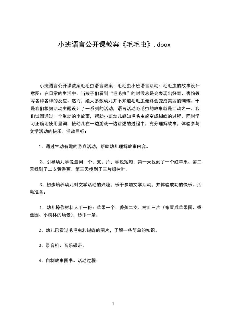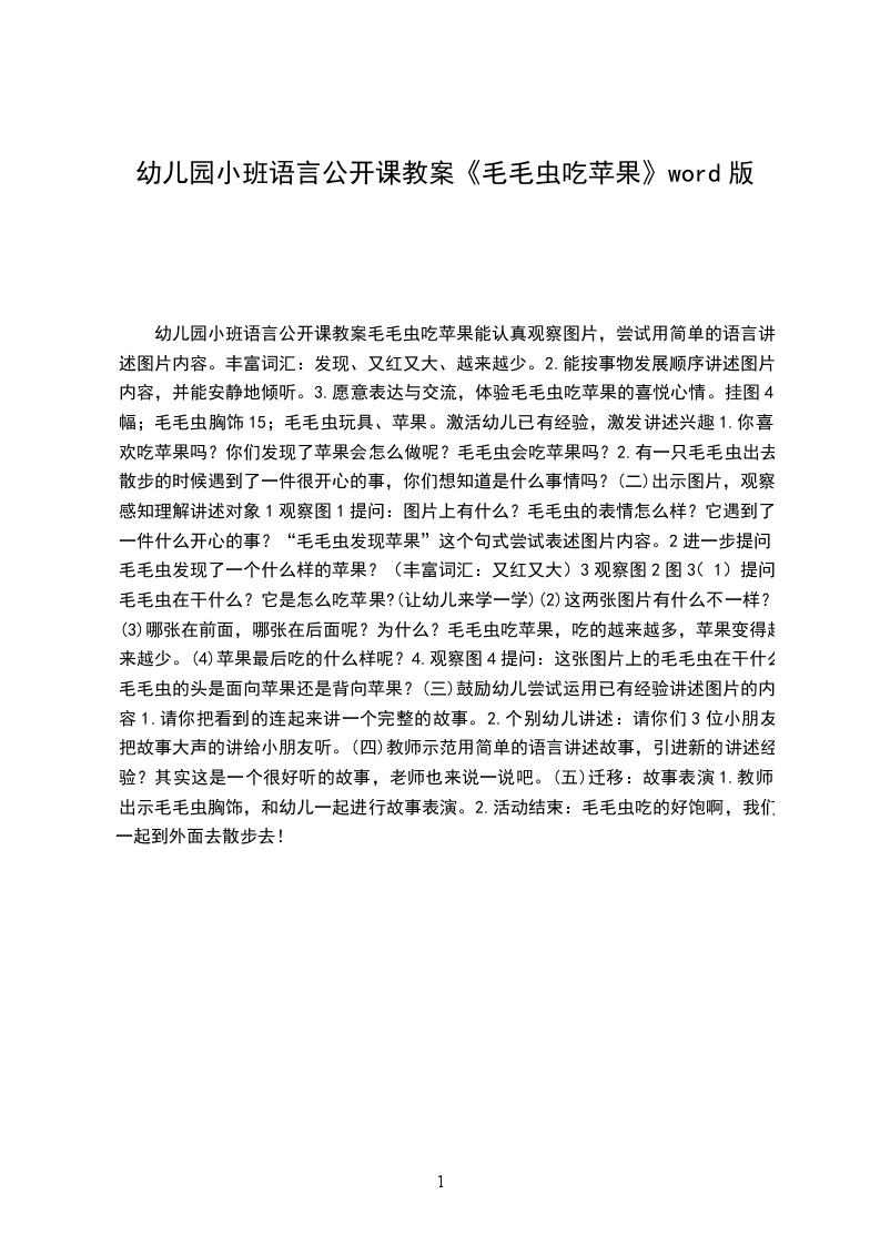 3.愿意表达与交流,体验毛毛虫吃苹果的喜悦心情。【活动准备】教学挂图4幅;毛毛虫胸饰15;毛毛虫玩具、苹果。【活动过程】