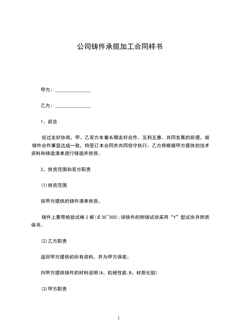 经过友好协商,甲、乙双方本着长期友好合作、互利互惠、共同发展的前提,就铸件合作事宜达成一致,特签订本合同并共同信守执行。乙方将根据甲方提供的技术资料和铸造清单进行铸造并供货。