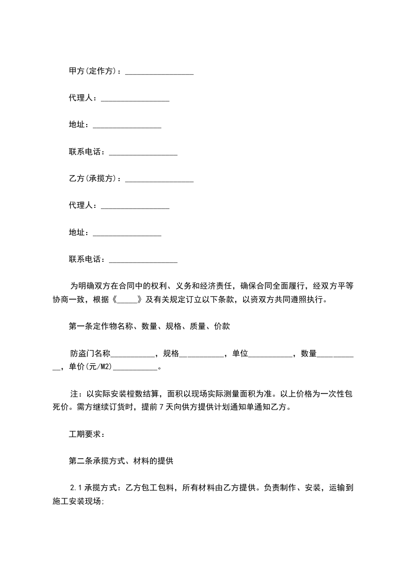 2.1承揽方式:乙方包工包料,所有材料由乙方提供。负责制作、安装,运输到施工安装现场;