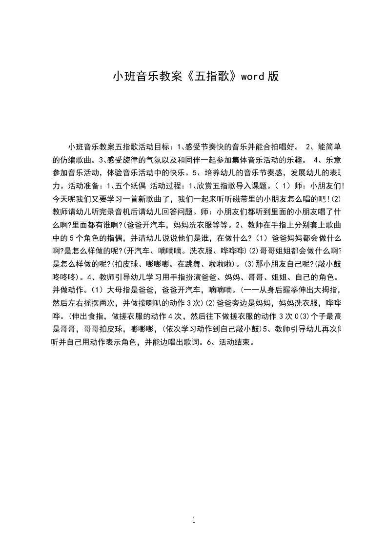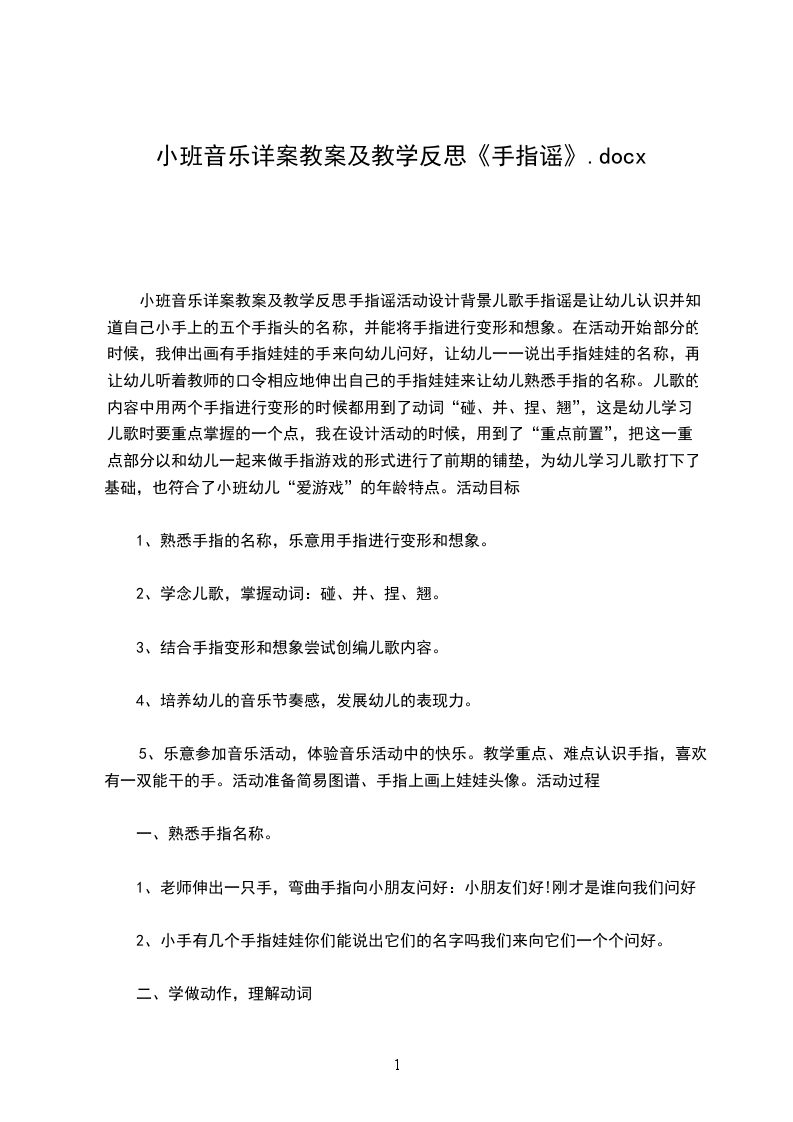 小班音乐详案教案及教学反思手指谣活动设计背景儿歌手指谣是让幼儿认识并知道自己小手上的五个手指头的名称,并能将手指进行变形和想象。在活动开始部分的时候,我伸出画有手指娃娃的手来向幼儿问好,让幼儿一一说出手指娃娃的名称,再让幼儿听着教师的口令相应地伸出自己的手指娃娃来让幼儿熟悉手指的名称。儿歌的内容中用两个手指进行变形的时候都用到了动词“碰、并、捏、翘”,这是幼儿学习儿歌时要重点掌握的一个点,我在设计活动的时候,用到了“重点前置”,把这一重点部分以和幼儿一起来做手指游戏的形式进行了前期的铺垫,为幼儿学习儿歌打下了基础,也符合了小班幼儿“爱游戏”的年龄特点。活动目标