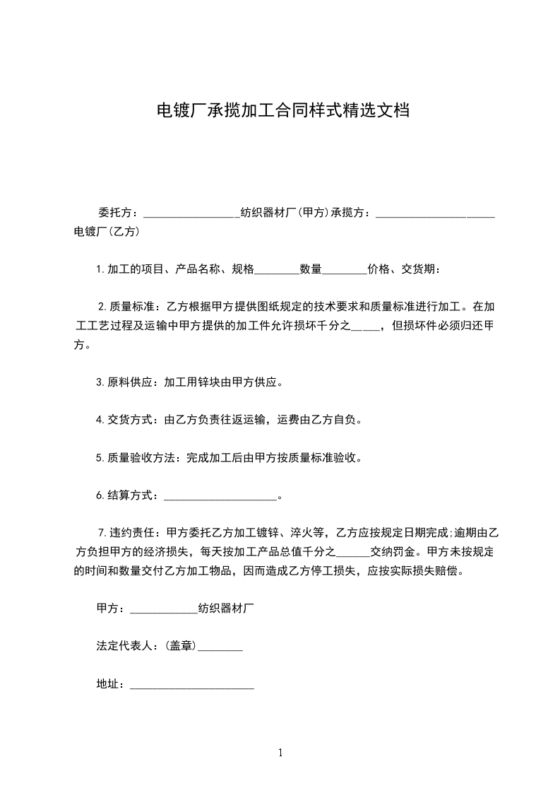 7.违约责任:甲方委托乙方加工镀锌、淬火等,乙方应按规定日期完成;逾期由乙方负担甲方的经济损失,每天按加工产品总值千分之______交纳罚金。甲方未按规定的时间和数量交付乙方加工物品,因而造成乙方停工损失,应按实际损失赔偿。