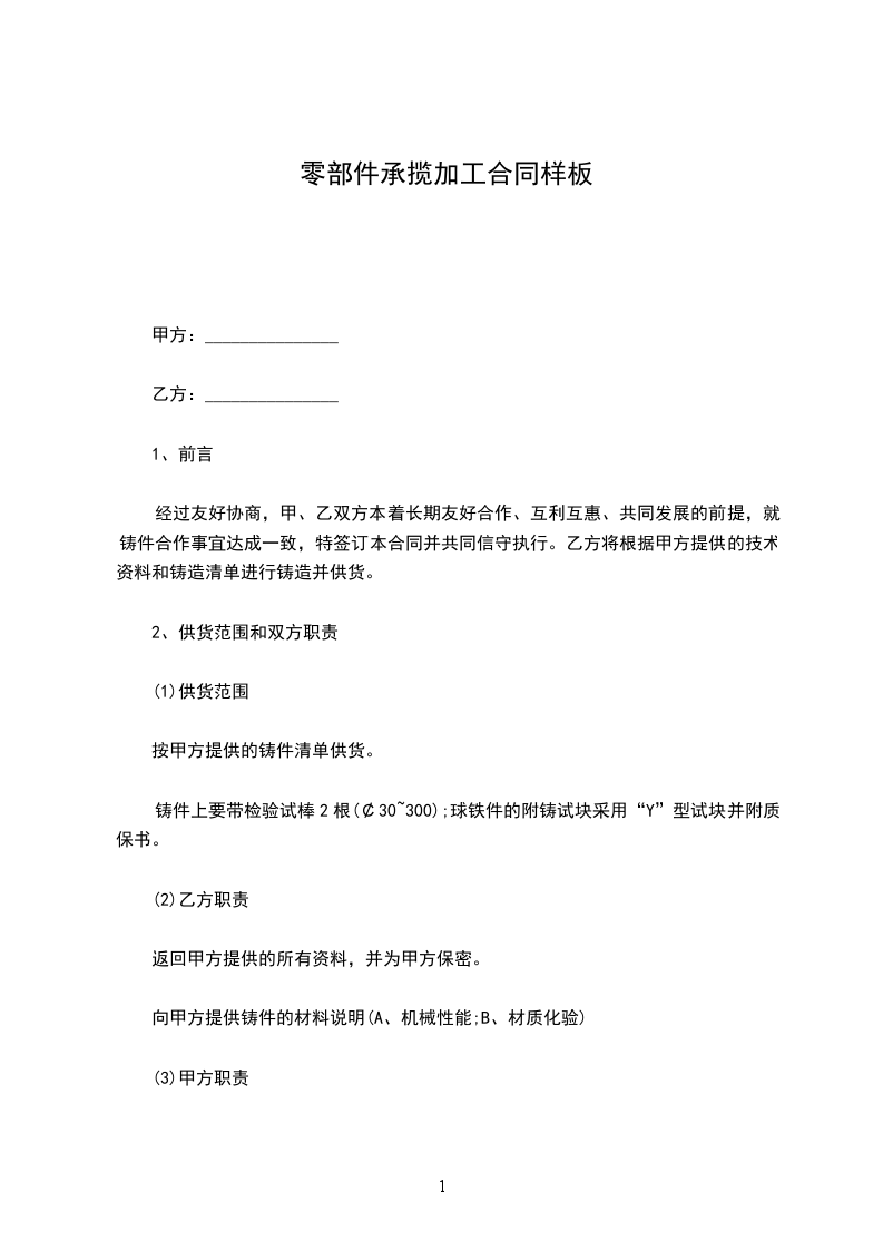 经过友好协商,甲、乙双方本着长期友好合作、互利互惠、共同发展的前提,就铸件合作事宜达成一致,特签订本合同并共同信守执行。乙方将根据甲方提供的技术资料和铸造清单进行铸造并供货。