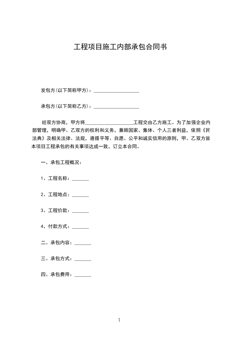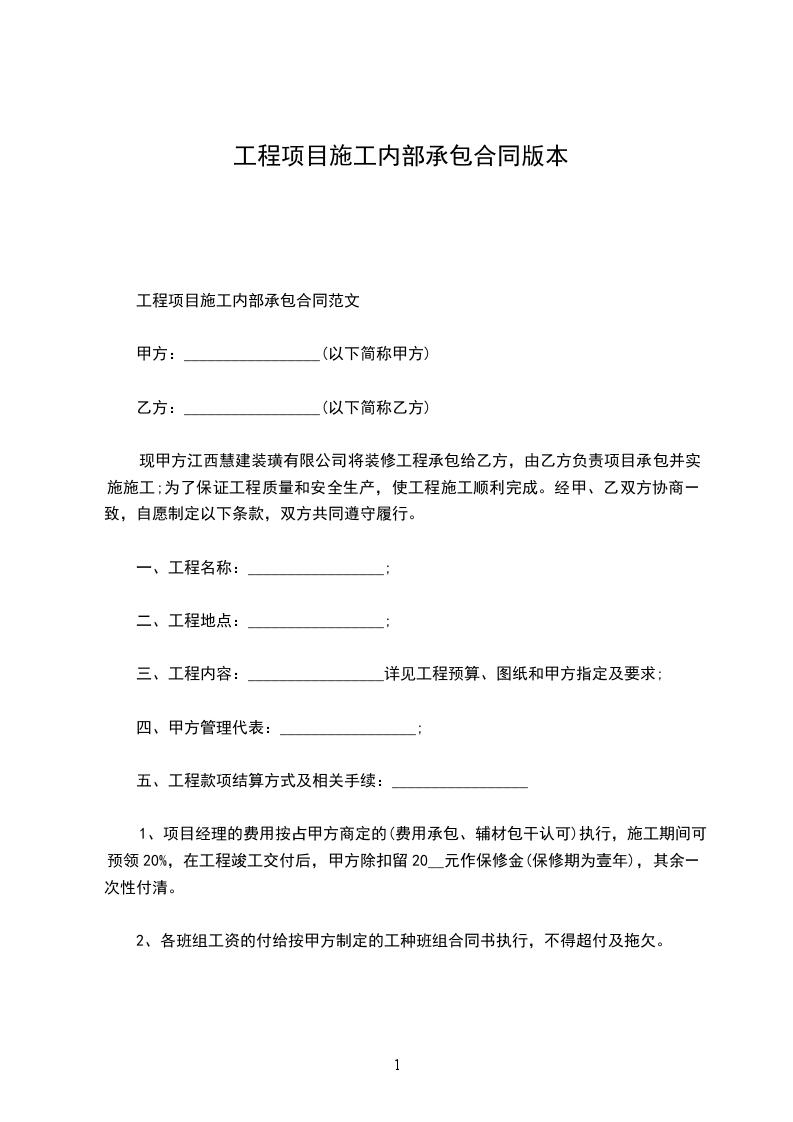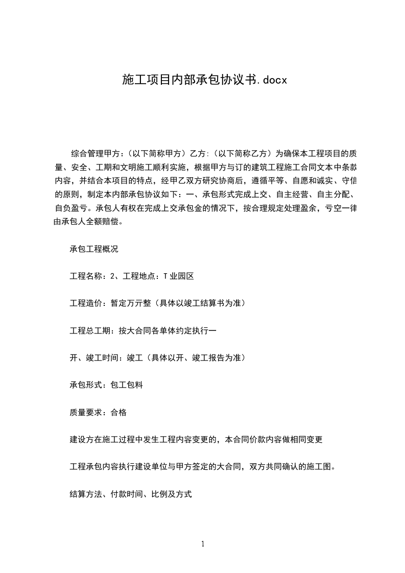 综合管理甲方:(以下简称甲方)乙方:(以下简称乙方)为确保本工程项目的质量、安全、工期和文明施工顺利实施,根据甲方与订的建筑工程施工合同文本中条款内容,并结合本项目的特点,经甲乙双方研究协商后,遵循平等、自愿和诚实、守信的原则,制定本内部承包协议如下:一、承包形式完成上交、自主经营、自主分配、自负盈亏。承包人有权在完成上交承包金的情况下,按合理规定处理盈余,亏空一律由承包人全额赔偿。