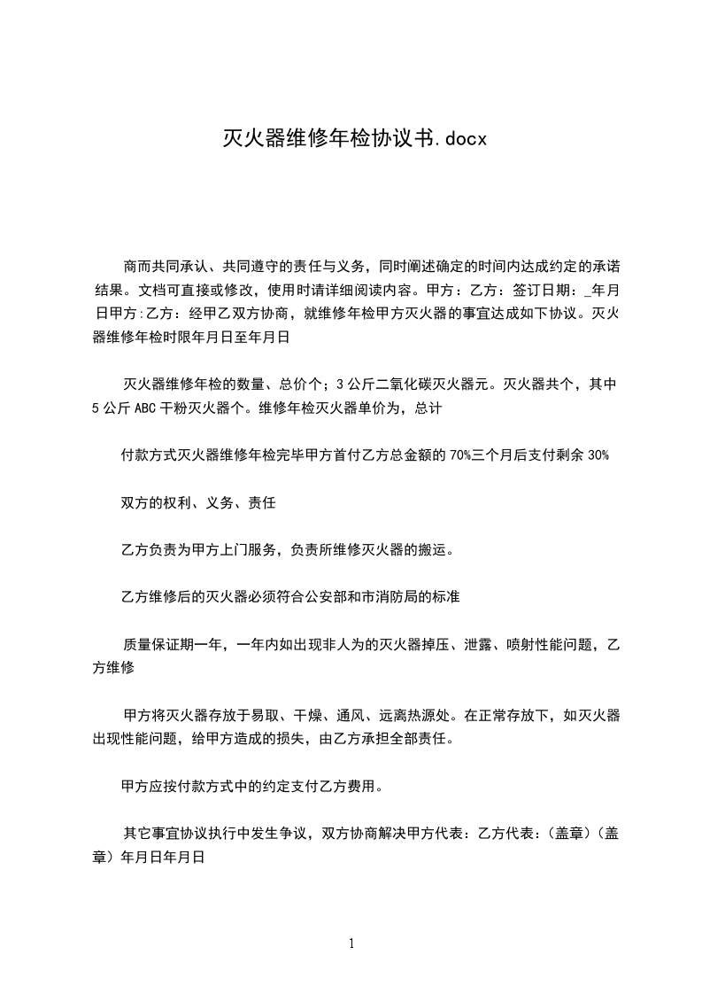 商而共同承认、共同遵守的责任与义务,同时阐述确定的时间内达成约定的承诺结果。文档可直接或修改,使用时请详细阅读内容。甲方:乙方:签订日期:_年月日甲方:乙方:经甲乙双方协商,就维修年检甲方灭火器的事宜达成如下协议。灭火器维修年检时限年月日至年月日