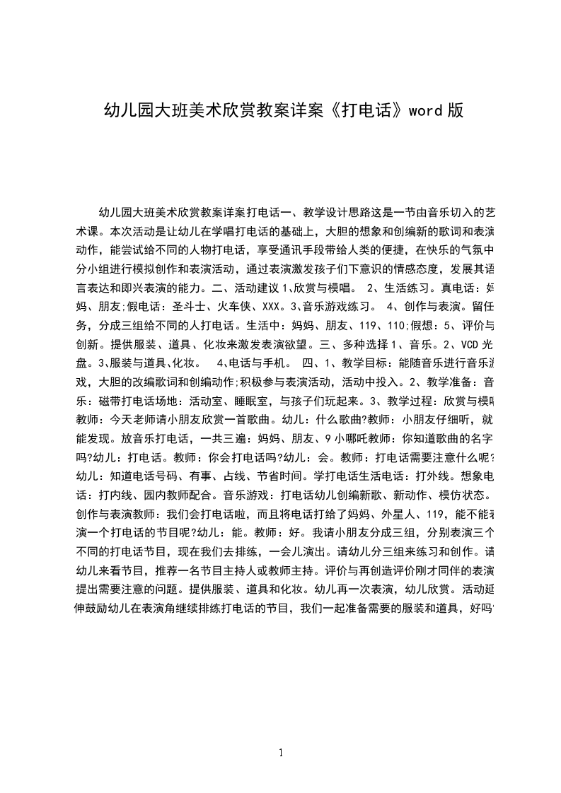 3、教学过程:欣赏与模唱教师:今天老师请小朋友欣赏一首歌曲。幼儿:什么歌曲教师:小朋友仔细听,就能发现。放音乐打电话,一共三遍:妈妈、朋友、9小哪吒教师:你知道歌曲的名字吗幼儿:打电话。教师:你会打电话吗幼儿:会。教师:打电话需要注意什么呢幼儿:知道电话号码、有事、占线、节省时间。学打电话生活电话:打外线。想象电话:打内线、园内教师配合。音乐游戏:打电话幼儿创编新歌、新动作、模仿状态。创作与表演教师:我们会打电话啦,而且将电话打给了妈妈、外星人、119,能不能表演一个打电话的节目呢幼儿:能。教师:好。我请小朋友分成三组,分别表演三个不同的打电话节目,现在我们去排练,一会儿演出。请幼儿分三组来练习和创作。请幼儿来看节目,推荐一名节目主持人或教师主持。评价与再创造评价刚才同伴的表演,提出需要注意的问题。提供服装、道具和化妆。幼儿再一次表演,幼儿欣赏。活动延伸鼓励幼儿在表演角继续排练打电话的节目,我们一起准备需要的服装和道具,好吗