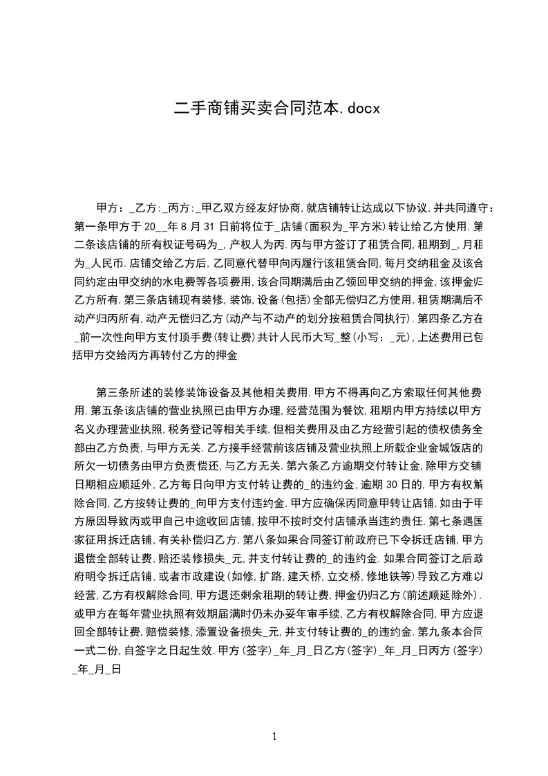 着法律法规不断完善,人们越发重视合同,很多场合都离不了合同,签订合同能够较为有效的约束违约行为。那么合同要怎么拟定?想必这让大家都很苦恼吧,二手商铺买卖合同1甲方:乙方:丙方:甲乙双方经友好协商,就店铺转让达成下列协议,并共同遵守:第一条甲方于年8月31日前将位于_店铺(面积为_平方米)转让给乙方使用。