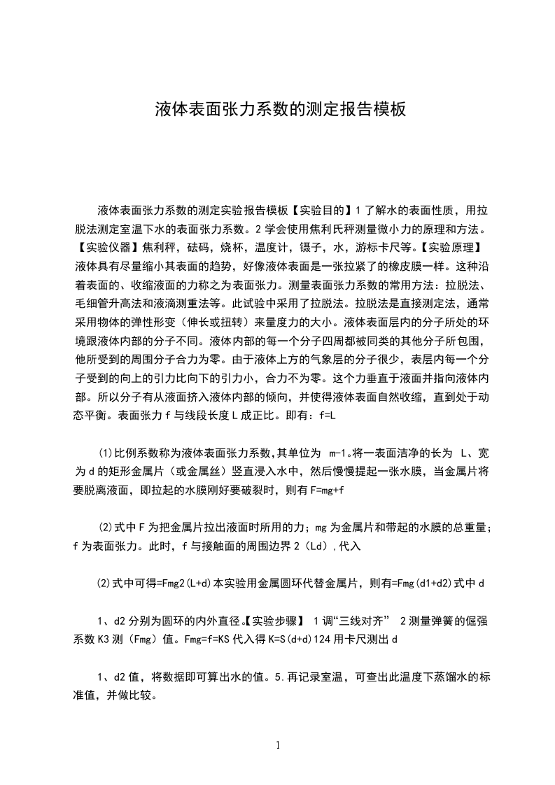 2、纯水液体表面张力系数的测量表2纯水的表面张力系数测量(水的温度T=25C)次数U(mv)U2(mv)U(mv)f(N)123456根据公式计算在室温下纯水的表面张力系数a。然后与标准值相比较,求出相对不确定度并写出结果表达式。