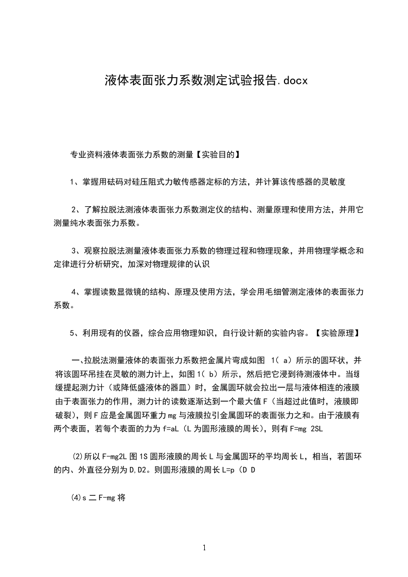 一、拉脱法测量液体的表面张力系数把金属片弯成如图1(a)所示的圆环状,并将该圆环吊挂在灵敏的测力计上,如图1(b)所示,然后把它浸到待测液体中。当缓缓提起测力计(或降低盛液体的器皿)时,金属圆环就会拉出一层与液体相连的液膜,由于表面张力的作用,测力计的读数逐渐达到一个最大值F(当超过此值时,液膜即破裂),则F应是金属圆环重力mg与液膜拉引金属圆环的表面张力之和。由于液膜有两个表面,若每个表面的力为f=aL(L为圆形液膜的周长),则有F=mg 2SL
