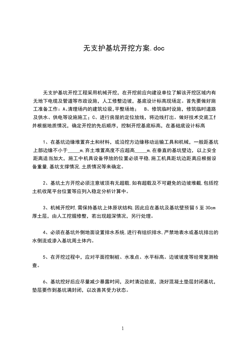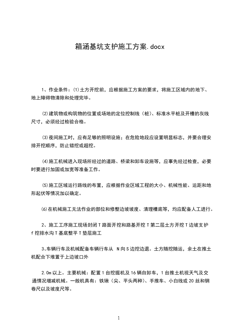 4、土方开挖施工技术措施土方开挖由专人指挥,采取分层分段对称开挖,并严格遵循“分层开挖、严禁超挖。当挖至标高接近基础底板标高时,边抄平边配合人工清槽,防止超挖,并按围护结构要求及时修整边坡及放坡,防止土方坍塌。渠底20m土方采用人工清理,然后用挖机带走。本工程基坑土方开挖每层厚度不大于5米,分层主要分为二层开挖:1)第一层为路面破除和路基开挖至5米。2)在进行第二层土方开挖时下边坡,根据现场土质情况,确定采用何种支护方式。3)开挖至基底以上20范围采用人工开挖防止超挖,在进行基础垫层施工前,人工突击挖除,并尽快进行下道工序施工。4)基坑开挖施工至基础底板标高时,应尽快完成素砼垫层支模、浇筑的全过程。5)开挖过程中,随时注意基坑四周的土质情况。当基坑沿顶面裂缝、槽壁松塌等影响基坑稳定时,立即加固支护。深槽两侧用土堆成30cm高土坝,防止地面水流入基坑,冲刷槽壁,基坑底外设置集水坑。基坑开挖成型后,周围外设置围栏,并用密目网封闭。同时在基坑两侧以及施工临时便道设置警示标志。6)基坑开挖及进行基础施工过程中,运土自卸汽车必须按既定的马道行走,基坑其他方向10米范围不许任何机动车辆通过,防止动荷载引起槽壁塌方。10米外车辆通过时,需加强对槽壁监测。7)基坑开挖过程中,施工机械不能刮擦桥台,要注意对原有涵洞的保护,基底高度保持1: