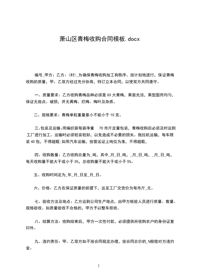 编号_甲方:乙方:(村)_为确保青梅收购加工有秩序、按计划地进行,保证青梅收购的质量,甲、乙双方经过充分协商,特订立本合同,以使双方共同遵守。