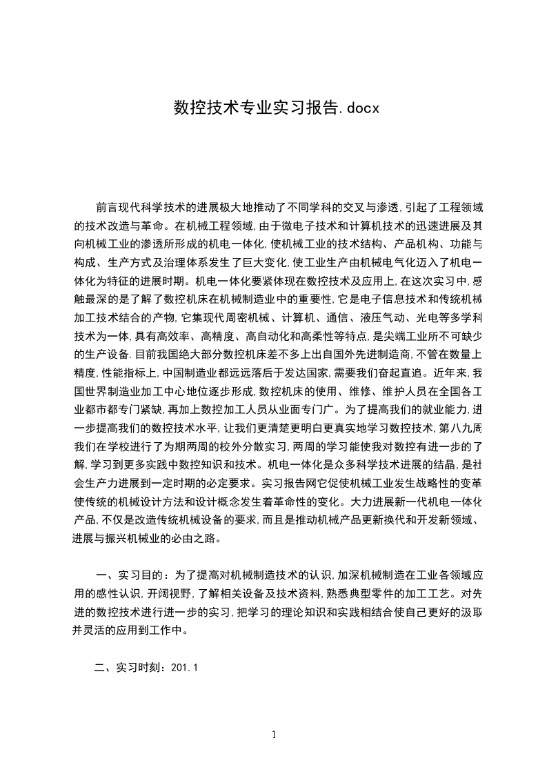 一、实习目的:为了提高对机械制造技术的认识,加深机械制造在工业各领域应用的感性认识,开阔视野,了解相关设备及技术资料,熟悉典型零件的加工工艺。对先进的数控技术进行进一步的实习,把学习的理论知识和实践相结合使自己更好的汲取并灵活的应用到工作中。