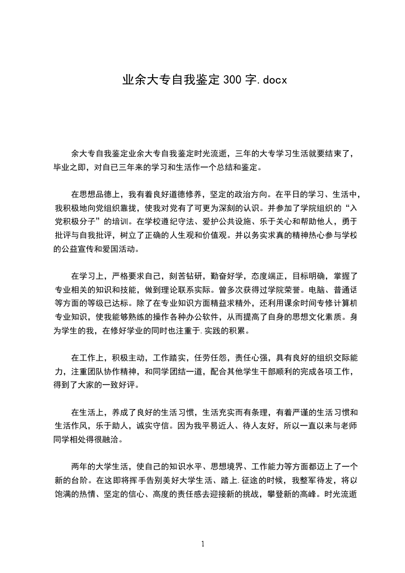 余大专自我鉴定业余大专自我鉴定时光流逝,三年的大专学习生活就要结束了,毕业之即,对自已三年来的学习和生活作一个总结和鉴定。