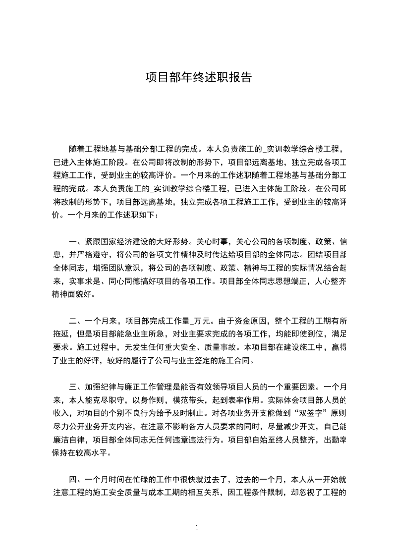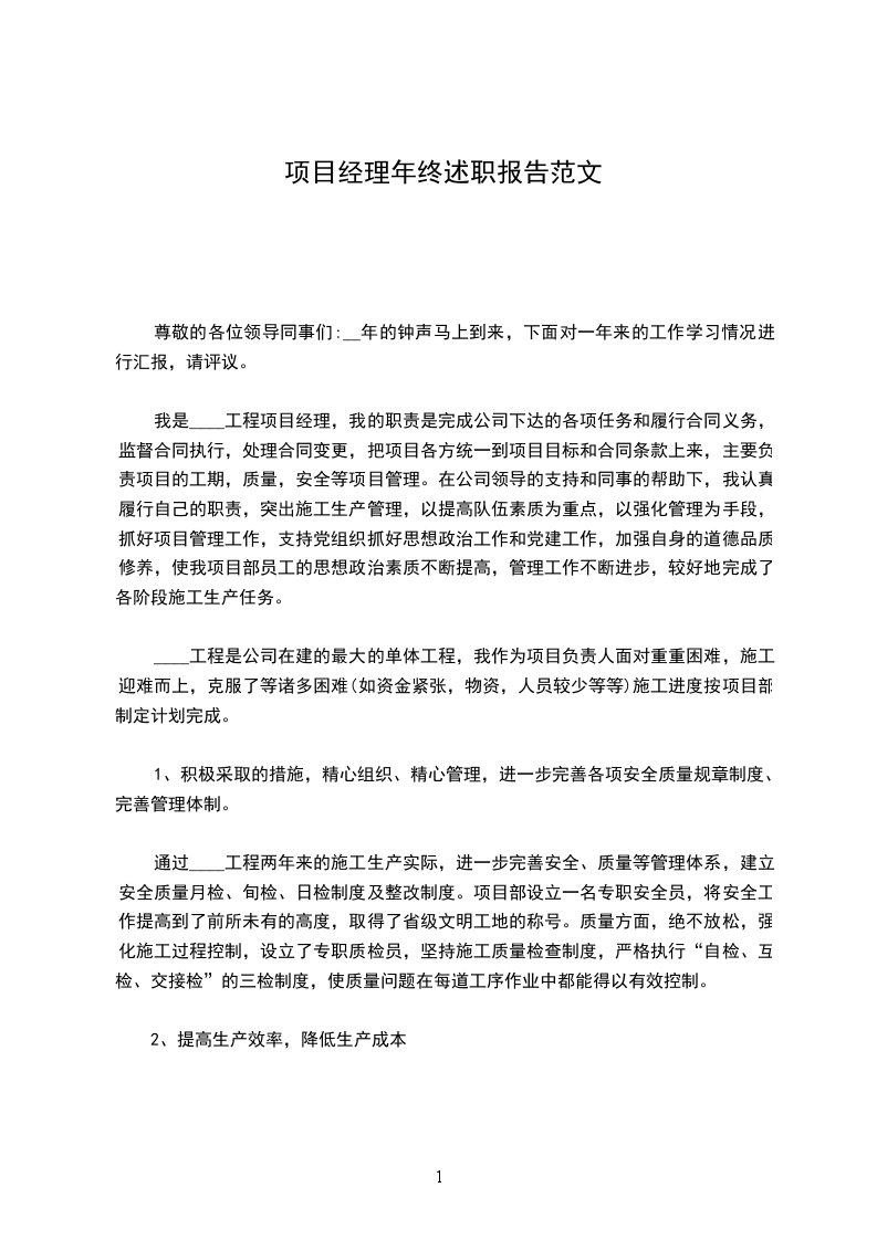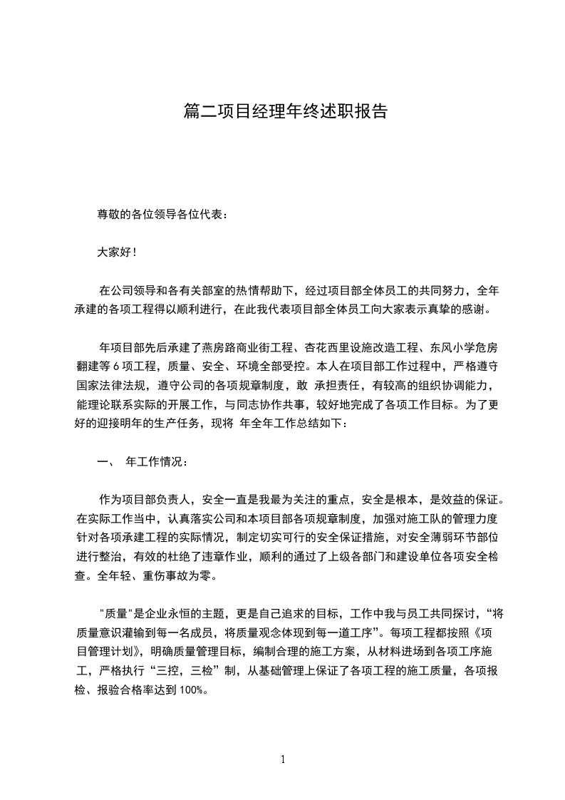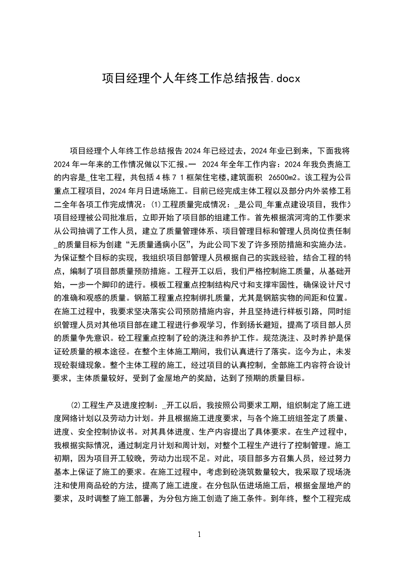 项目经理个人年终工作总结报告2024年已经过去,2024年业已到来,下面我将2024年一年来的工作情况做以下汇报。一2024年全年工作内容:2024年我负责施工的内容是_住宅工程,共包括4栋7 1框架住宅楼,建筑面积26500m2。该工程为公司重点工程项目,2024年月日进场施工。目前已经完成主体工程以及部分内外装修工程。二全年各项工作完成情况:(1)工程质量完成情况:_是公司_年重点建设项目,我作为项目经理被公司批准后,立即开始了项目部的组建工作。首先根据滨河湾的工作要求,从公司抽调了工作人员,建立了质量管理体系、项目管理目标和管理人员岗位责任制。_的质量目标为创建“无质量通病小区”,为此公司下发了许多预防措施和实施办法。为保证整个目标的实现,我组织项目部管理人员根据自己的实践经验,结合工程的特点,编制了项目部质量预防措施。工程开工以后,我们严格控制施工质量,从基础开始,一步一个脚印的进行。模板工程重点控制结构尺寸和支撑牢固性,确保设计尺寸的准确和观感的质量。钢筋工程重点控制绑扎质量,尤其是钢筋实物的间距和位置。在施工过程中,我要求坚决落实公司预防措施内容,并且坚持进行样板引路,同时组织管理人员对其他项目部在建工程进行参观学习,作到扬长避短,提高了项目部人员的质量争先意识。砼工程重点控制了砼的浇注和养护工作。规范浇注、及时养护是保证砼质量的根本途径。在整个主体施工期间,我们认真进行了落实。迄今为止,未发现砼裂缝现象。整个主体工程的施工,经过项目的认真控制,全部施工内容符合设计要求,主体质量较好,受到了金屋地产的奖励,达到了预期的质量目标。