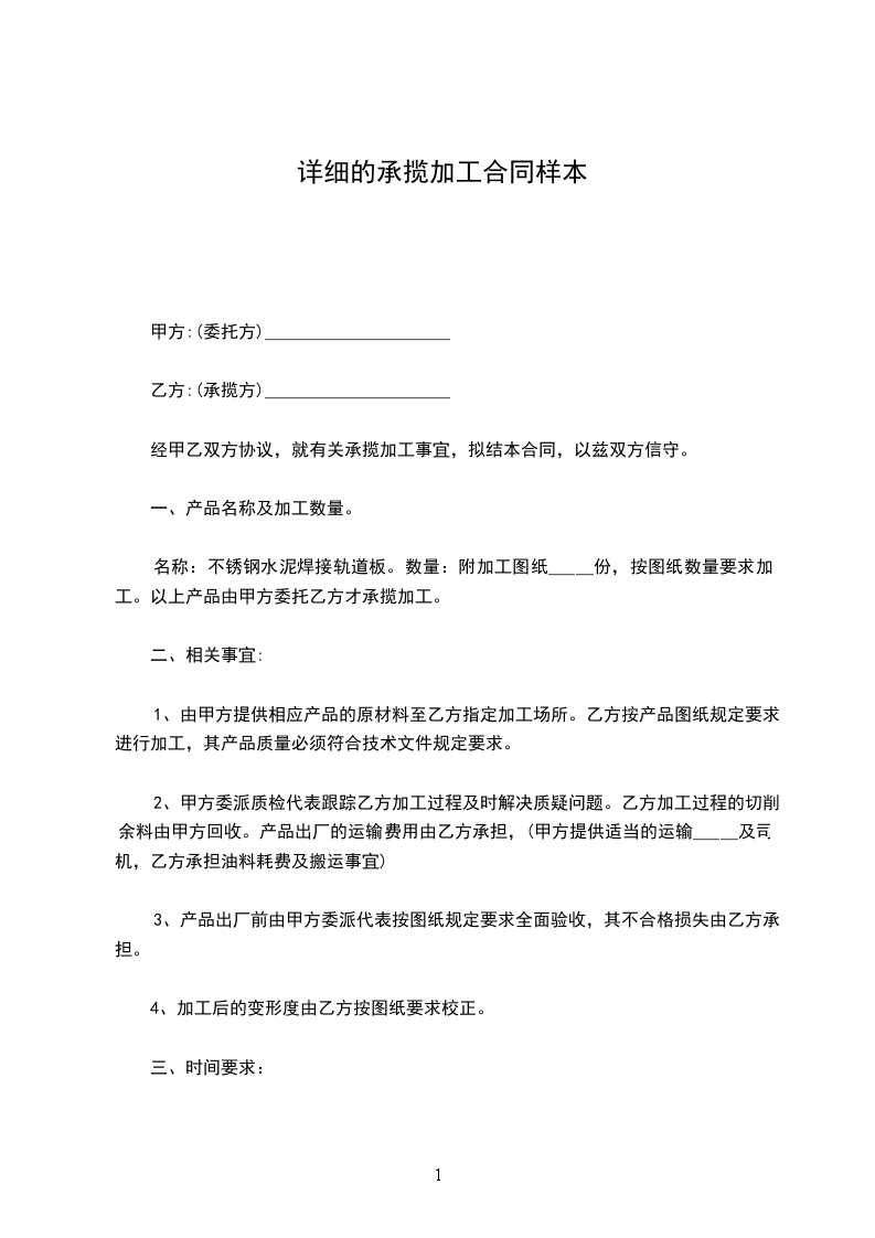 名称:不锈钢水泥焊接轨道板。数量:附加工图纸_____份,按图纸数量要求加工。以上产品由甲方委托乙方才承揽加工。