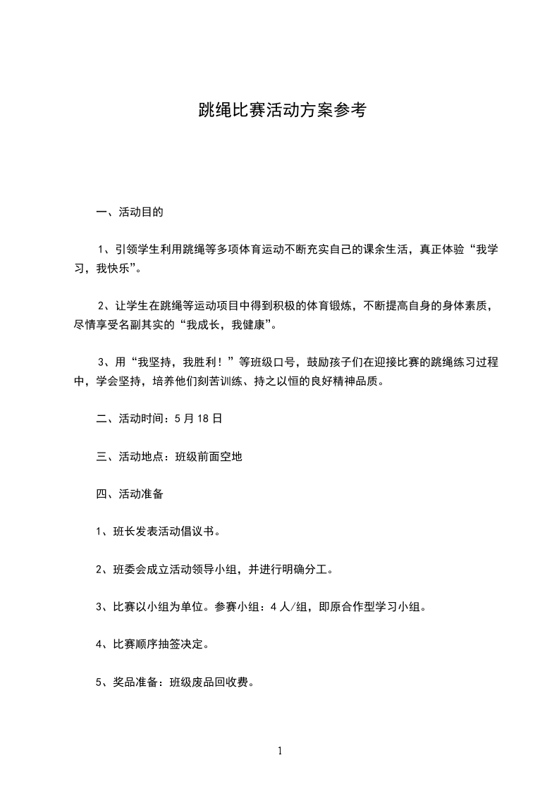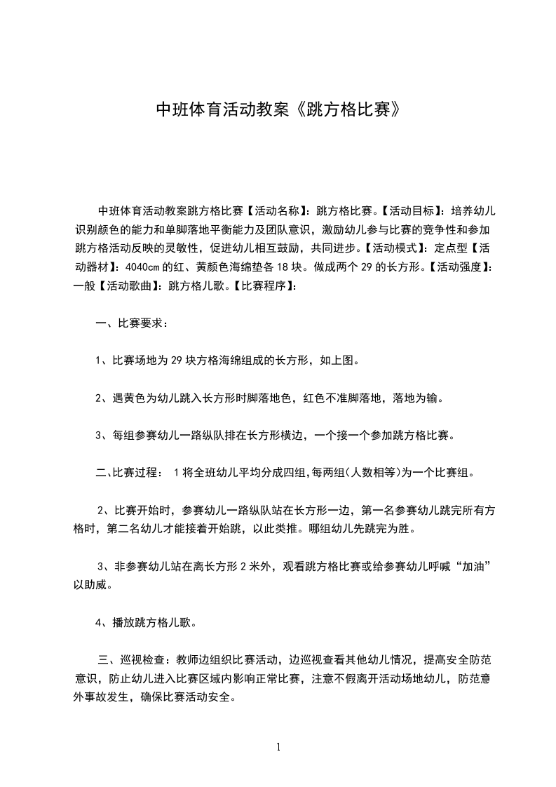 中班体育活动教案跳方格比赛【活动名称】:跳方格比赛。【活动目标】:培养幼儿识别颜色的能力和单脚落地平衡能力及团队意识,激励幼儿参与比赛的竞争性和参加跳方格活动反映的灵敏性,促进幼儿相互鼓励,共同进步。【活动模式】:定点型【活动器材】:4040cm的红、黄颜色海绵垫各18块。做成两个29的长方形。【活动强度】:一般【活动歌曲】:跳方格儿歌。【比赛程序】:
