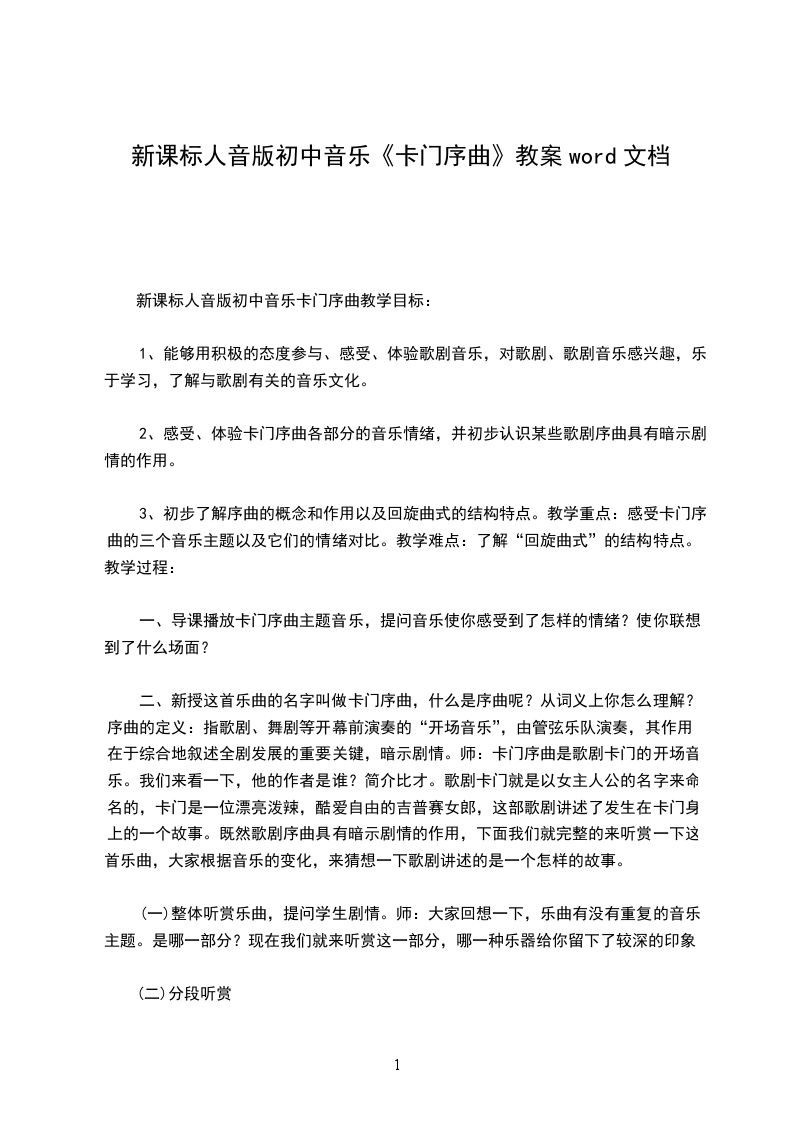 1、首先来欣赏作品卡门序曲(录像)一一欣赏到第一大段落结束,(在一般的音乐会演奏时,我们所欣赏到的卡门序曲就结束了,而在歌剧中的序曲乐曲没有完,让我们来继续欣赏。(磁带)学生的感受。