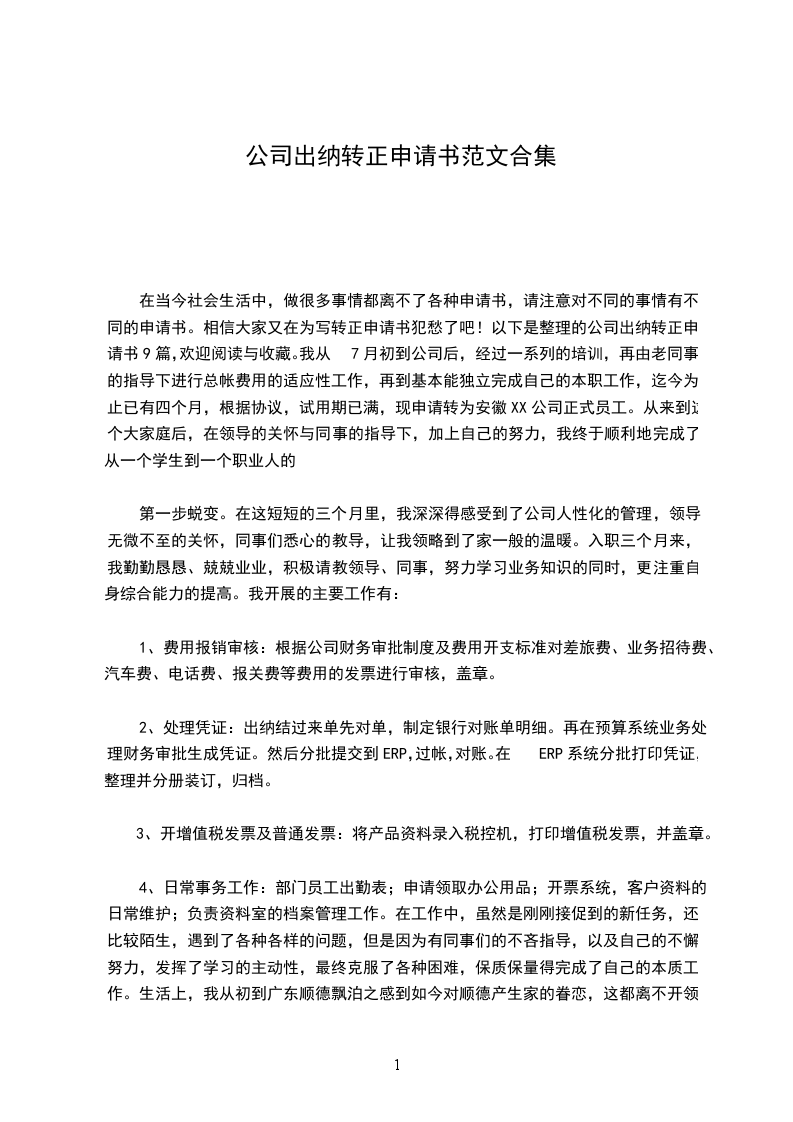 4、日常事务工作:部门员工出勤表;申请领取办公用品;开票系统,客户资料的日常维护;负责资料室的档案管理工作。在工作中,虽然是刚刚接促到的新任务,还比较陌生,遇到了各种各样的问题,但是因为有同事们的不吝指导,以及自己的不懈努力,发挥了学习的主动性,最终克服了各种困难,保质保量得完成了自己的本质工作。生活上,我从初到__顺德飘泊之感到如今对顺德产生家的眷恋,这都离不开领导、同事的悉心指导与关怀!也离不开顺德这片热土对外来文化的悦纳与包容!我热爱这片热土,更热爱这份工作,因此我对目前的工作倍感珍惜!在我的内心深处,我感到自己早已经与顺德、与__融为了一体。作为一名刚毕业的大学生,我想我一定将尽自己的最大努力做好这份工作。虽然我尚有许多不足,但我相信通过自己的不懈努力,认真总结,看到自己的不足,虚心向同事们学习并加以改正,我将能不断提高自己,取得应有的成绩。在此我提出转正申请,恳请领导能给我继续奉献自己、实现理想的机会。我渴望着能与__的同仁们共同进步,共同成长!我将继续以饱满的热情投入到工作中去,和所有愿意为__的发展付出努力的人一道贡献自己的力量。此致敬礼!公司出纳转正申请书篇9尊敬的公司领导:我于20__年__月__日进入公司,根据公司的需要,目前担任出纳一职。初来公司,曾经很担心不知该怎么与人共处,该如何做好工作;但是公司宽松融洽的工作氛围、团结向上的企业精神,让我很快完成了转变。领导和同事的耐心指导,使我们在较短的时间内适应了公司的工作环境,也熟悉了公司的基本操作流程。在这期间我积极学习新知识、新技能,注重自身发展和进步,以期将来能学以致用,同公司共同发展、进步。三个多月来,我在张X、曲姐、公司领导和同事们的热心帮助及关爱下取得了一定的进步,但是这其中也有许多不足,综合看来,我觉得自己还有以下的缺点和: