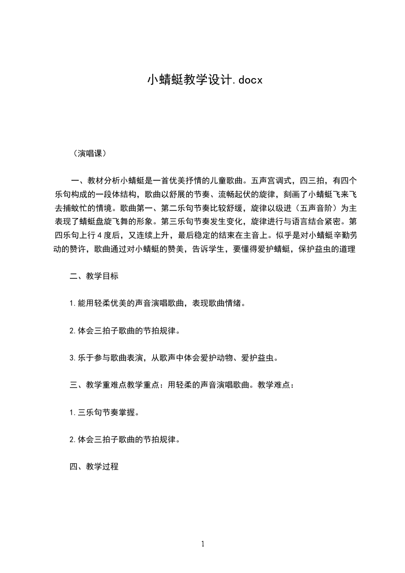 一、教材分析小蜻蜓是一首优美抒情的儿童歌曲。五声宫调式,四三拍,有四个乐句构成的一段体结构,歌曲以舒展的节奏、流畅起伏的旋律,刻画了小蜻蜓飞来飞去捕蚊忙的情境。歌曲第一、第二乐句节奏比较舒缓,旋律以级进(五声音阶)为主,表现了蜻蜓盘旋飞舞的形象。第三乐句节奏发生变化,旋律进行与语言结合紧密。第四乐句上行4度后,又连续上升,最后稳定的结束在主音上。似乎是对小蜻蜓辛勤劳动的赞许,歌曲通过对小蜻蜓的赞美,告诉学生,要懂得爱护蜻蜓,保护益虫的道理。