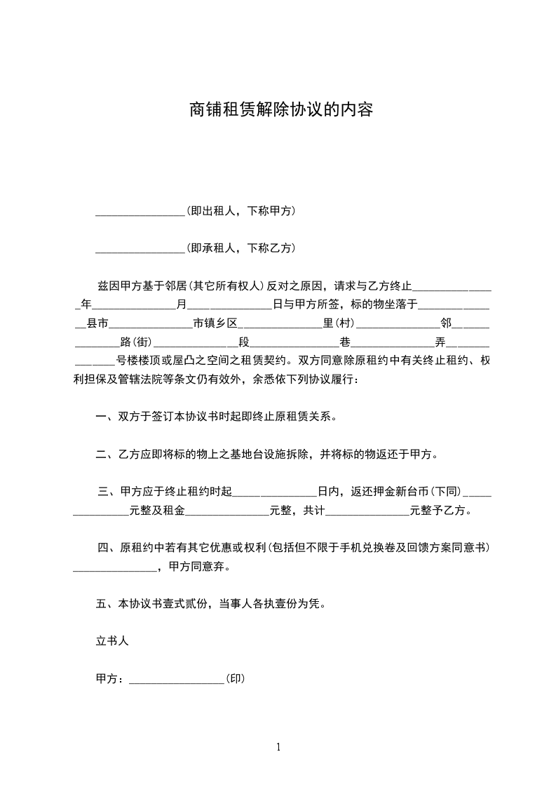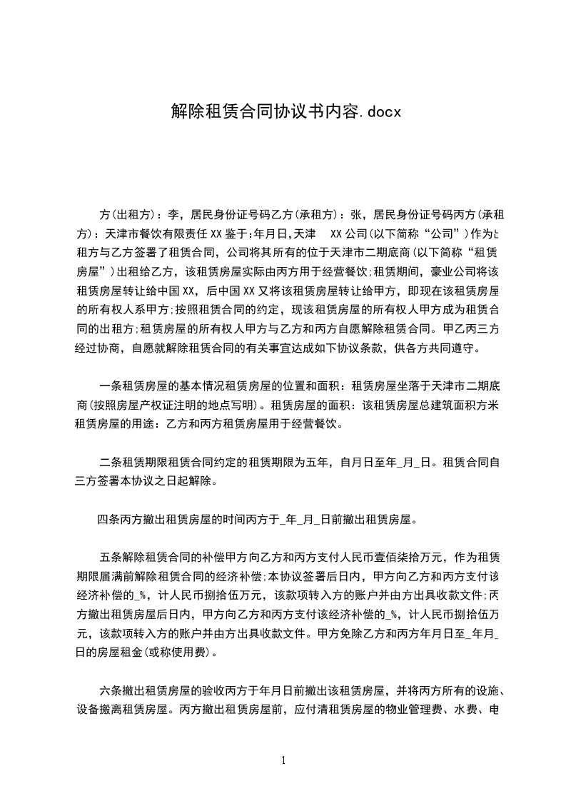 方(出租方):李,居民身份证号码乙方(承租方):张,居民身份证号码丙方(承租方):天津市餐饮有限责任XX鉴于:年月日,天津XX公司(以下简称“公司”)作为出租方与乙方签署了租赁合同,公司将其所有的位于天津市二期底商(以下简称“租赁房屋”)出租给乙方,该租赁房屋实际由丙方用于经营餐饮;租赁期间,豪业公司将该租赁房屋转让给中国XX,后中国XX又将该租赁房屋转让给甲方,即现在该租赁房屋的所有权人系甲方;按照租赁合同的约定,现该租赁房屋的所有权人甲方成为租赁合同的出租方;租赁房屋的所有权人甲方与乙方和丙方自愿解除租赁合同。甲乙丙三方经过协商,自愿就解除租赁合同的有关事宜达成如下协议条款,供各方共同遵守。