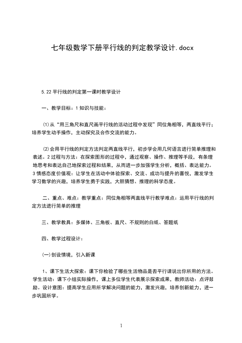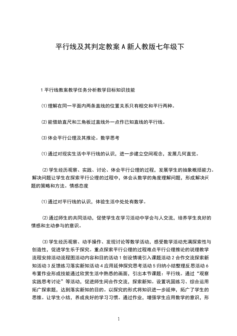 2、两直线垂直的表示。引入:阅读教材521的“思考,并通过实验得出:有两条直线不相交的情形。并举出在日常生活中两条直线不相交的例子。总结出两条直线不相交的情形平行。探究活动1:什么叫平行线平行的书写符号:,比方直线a与直线b平行应记作或,直线AB与直线CD平行应记作或。注意:平行线的定义包含三层意思:1“在同一平面内是前提条件,2“不相交就是说两条直线没有交点,3平行线指的是“两条直线而不是两条射线或两条线段。探究活动2:同一平面内两直线的位置关系有哪几种,图形,符号表示。,图形,符号表示。,图形,符号表示。探究活动3:如何画平行线1用一副三角板画。一般步骤:。2在方格纸上画平行线。探究活动4:在转动木条a的过程中,有几个位置使得a与b平行如图,过点B画直线a的平行线,能画出几条再过点C画直线a的平行线,它和前面过点B画出的直线平行吗通过作图总结出平行公理:。以及一个平行线的判定方法:,用数学符号表示:。小结: