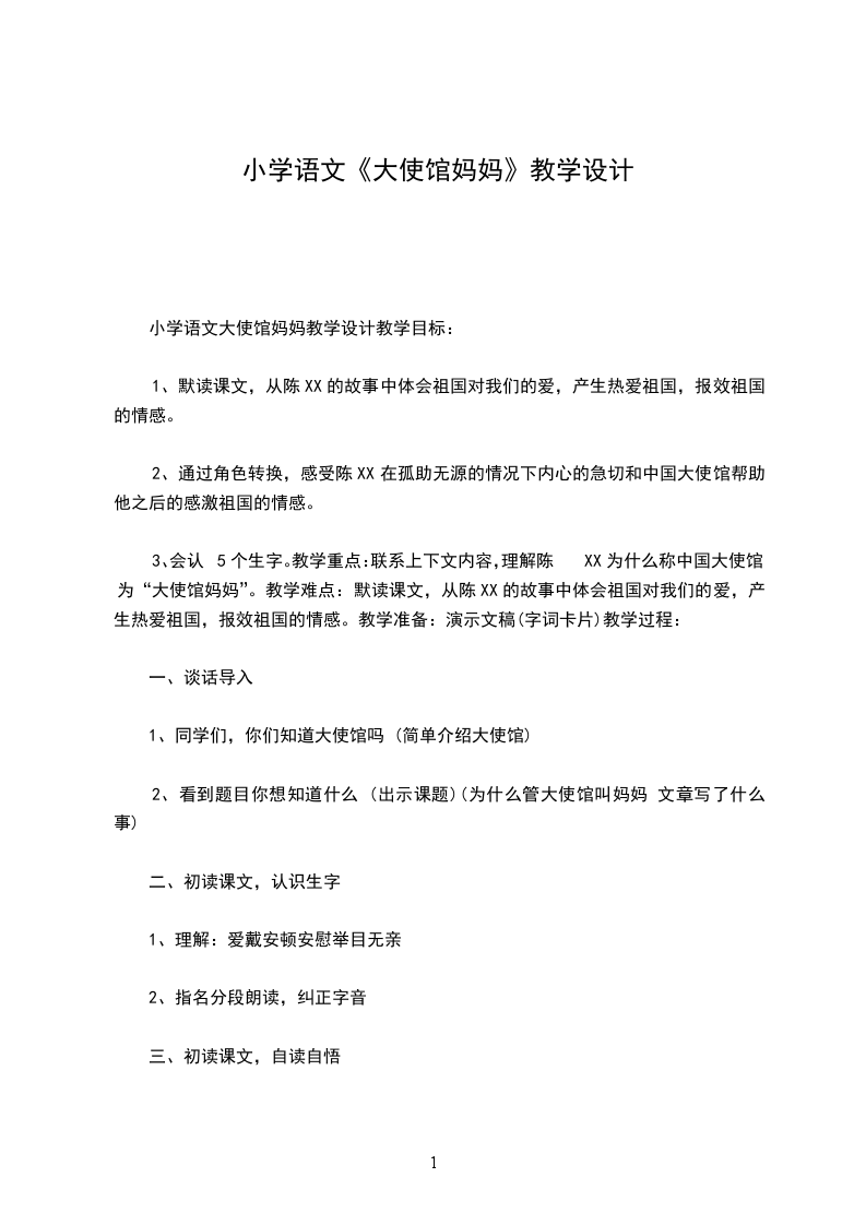 3、会认5个生字。教学重点:联系上下文内容,理解陈XX为什么称中国大使馆为“大使馆妈妈”。教学难点:默读课文,从陈XX的故事中体会祖国对我们的爱,产生热爱祖国,报效祖国的情感。教学准备:演示文稿(字词卡片)教学过程: