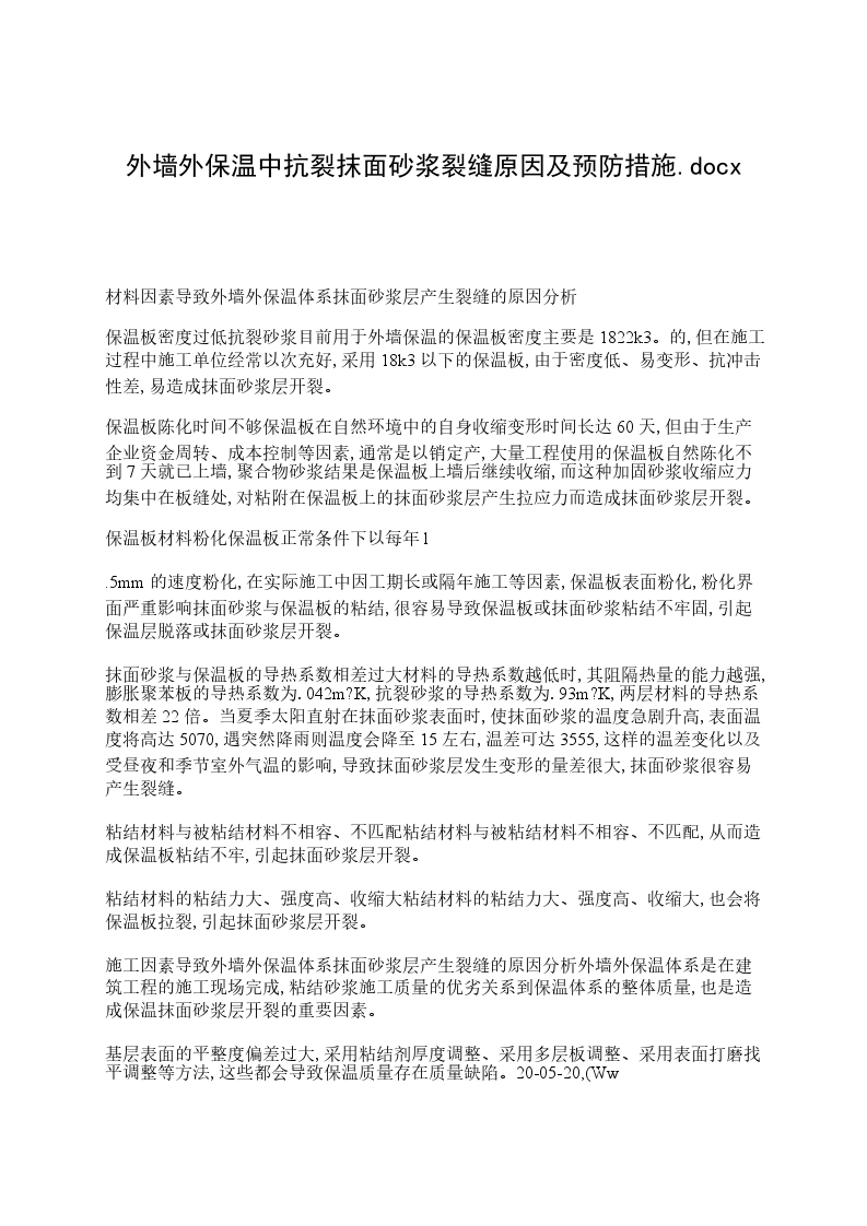 抹面砂浆与保温板的导热系数相差过大材料的导热系数越低时,其阻隔热量的能力越强,膨胀聚苯板的导热系数为.042m?K,抗裂砂浆的导热系数为.93m?K,两层材料的导热系数相差22倍。当夏季太阳直射在抹面砂浆表面时,使抹面砂浆的温度急剧升高,表面温度将高达5070,遇突然降雨则温度会降至15左右,温差可达3555,这样的温差变化以及受昼夜和季节室外气温的影响,导致抹面砂浆层发生变形的量差很大,抹面砂浆很容易产生裂缝。