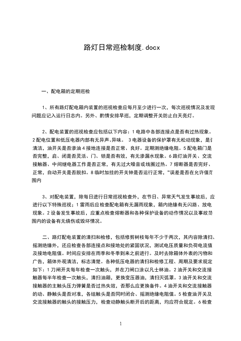 1、所有路灯配电箱内装置的巡视检查应每月至少进行一次,每次巡视情况及发现问题应记入运行日志内。另外、酌情安排早巡,定期调整开关防止白天亮灯。