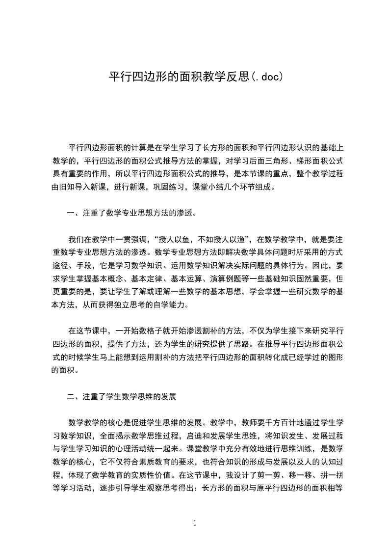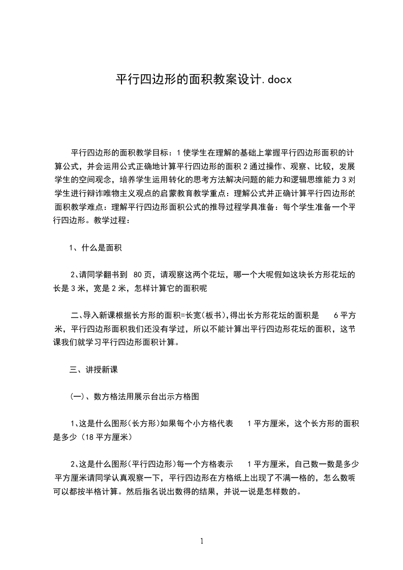 平行四边形的面积教学目标:1使学生在理解的基础上掌握平行四边形面积的计算公式,并会运用公式正确地计算平行四边形的面积2通过操作、观察、比较,发展学生的空间观念,培养学生运用转化的思考方法解决问题的能力和逻辑思维能力3对学生进行辩诈唯物主义观点的启蒙教育教学重点:理解公式并正确计算平行四边形的面积教学难点:理解平行四边形面积公式的推导过程学具准备:每个学生准备一个平行四边形。教学过程: