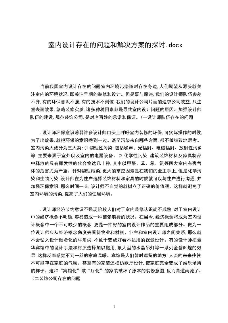 .片面追求公司利益,不考虑客户需求现代多数装饰设计公司的做法是设计咨询“”与,施工赵方武汉科技大学城市学院430083摘要:随着人们健康观念的不断提高,居室设计要求也越来越高,其中室内环境质量控制越来越引起社会各界的广泛关注。由于人的一生中很大一部分时间是在室内度过,因此室内环境质量的优劣,必然直接影响到人们的安全、卫生、效率和舒适。但是室内设计却存在很大的问题,那么这些问题该如何解决?本文对此进行了简单的探讨。关键词:设计师装饰公司环保技术“一条龙”服务。这样一来,设计师往往会为公司和自身的利益考虑,做出一些不太符合客户实际的设计。