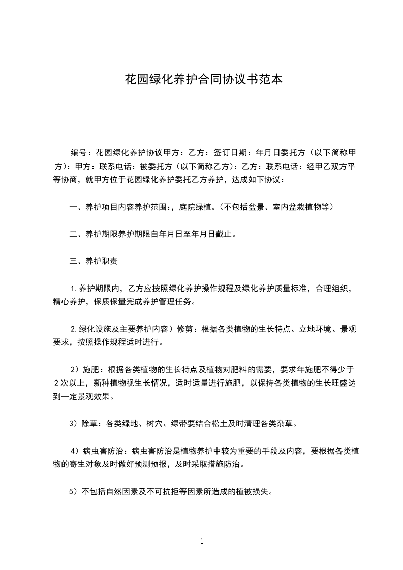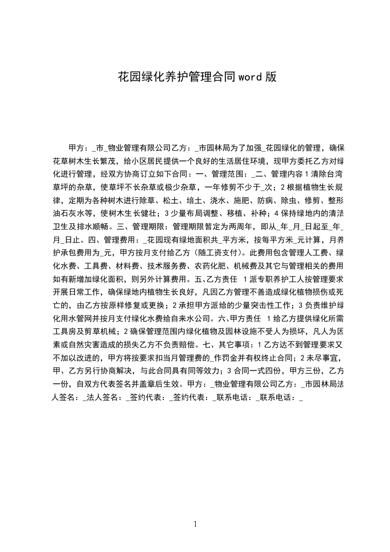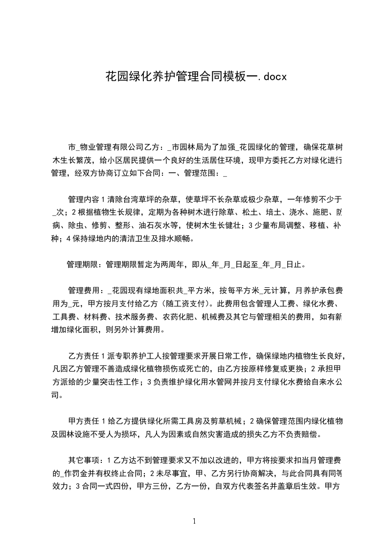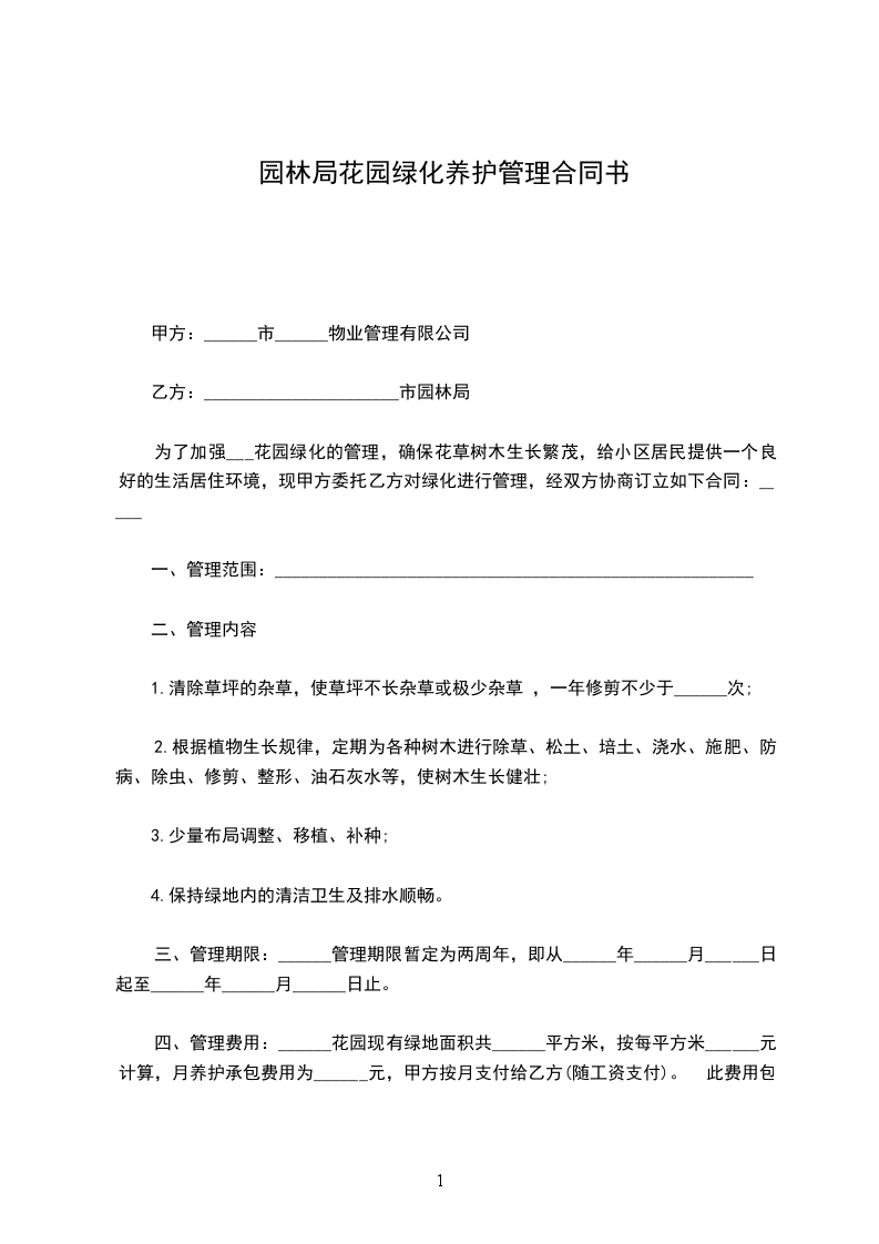 市_物业管理有限公司乙方:_市园林局为了加强_花园绿化的管理,确保花草树木生长繁茂,给小区居民提供一个良好的生活居住环境,现甲方委托乙方对绿化进行管理,经双方协商订立如下合同:一、管理范围:_