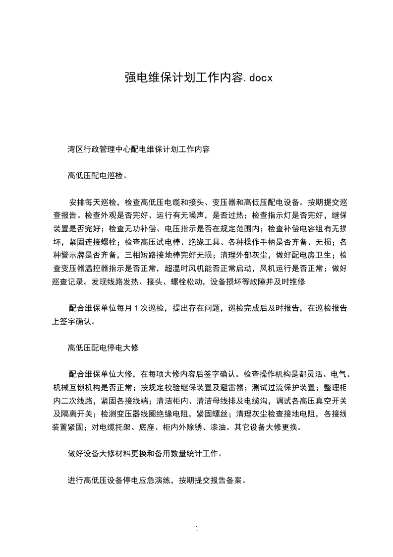 安排每天巡检,检查高低压电缆和接头、变压器和高低压配电设备。按期提交巡查报告。检查外观是否完好、运行有无噪声,是否过热;检查指示灯是否完好,继保装置是否完好;检查无功补偿、电压指示是否在规定范围内;检查补偿电容组有无损坏,紧固连接螺栓;检查高压试电棒、绝缘工具、各种操作手柄是否齐备、无损;各种警示牌是否齐备,三相短路接地棒完好无损;清理外部灰尘,做好配电房卫生;检查变压器温控器指示是否正常,超温时风机能否正常启动,风机运行是否正常;做好巡查记录。发现线路发热、接头、螺栓松动,设备损坏等故障并及时维修