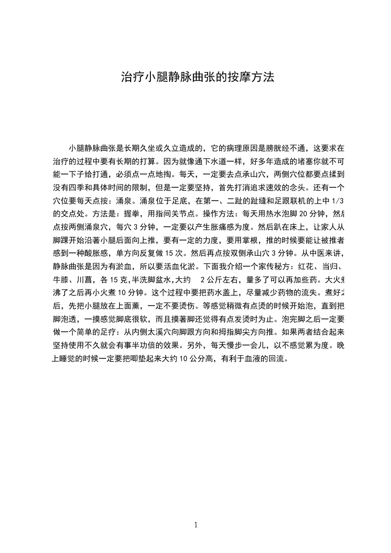 小腿静脉曲张是长期久坐或久立造成的,它的病理原因是膀胱经不通,这要求在治疗的过程中要有长期的打算。因为就像通下水道一样,好多年造成的堵塞你就不可能一下子给打通,必须点一点地掏。每天,一定要去点承山穴,两侧穴位都要点揉到,没有四季和具体时间的限制,但是一定要坚持,首先打消追求速效的念头。还有一个穴位要每天点按:涌泉。涌泉位于足底,在第一、二趾的趾缝和足跟联机的上中1/3的交点处。方法是:握拳,用指间关节点。操作方法:每天用热水泡脚20分钟,然后点按两侧涌泉穴,每穴3分钟,一定要以产生胀痛感为度。然后趴在床上,让家人从脚踝开始沿著小腿后面向上推,要有一定的力度,要用掌根,推的时候要能让被推者感到一种酸胀感,单方向反复做15次。然后再点按双侧承山穴3分钟。从中医来讲,静脉曲张是因为有淤血,所以要活血化淤。下面我介绍一个家传秘方:红花、当归、牛膝、川菖,各15克,半洗脚盆水,大约2公斤左右,量多了可以再加些药。大火煮沸了之后再小火煮10分钟。这个过程中要把药水盖上,尽量减少药物的流失。煮好之后,先把小腿放在上面薰,一定不要烫伤。等感觉稍微有点烫的时候开始泡,直到把脚泡透,一摸感觉脚底很软,而且摸著脚还觉得有点发烫时为止。泡完脚之后一定要做一个简单的足疗:从内侧太溪穴向脚跟方向和拇指脚尖方向推。如果两者结合起来,坚持使用不久就会有事半功倍的效果。另外,每天慢步一会儿,以不感觉累为度。晚上睡觉的时候一定要把唧垫起来大约10公分高,有利于血液的回流。