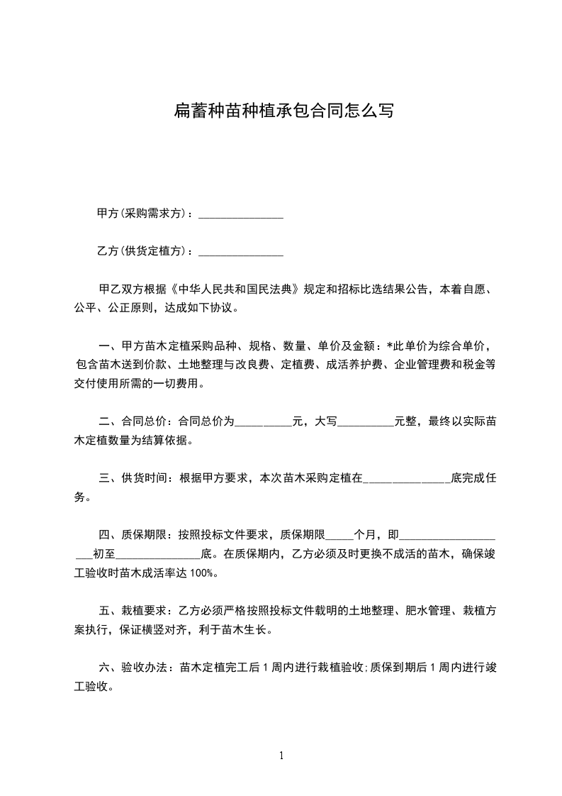 二、合同总价:合同总价为__________元,大写__________元整,最终以实际苗木定植数量为结算依据。