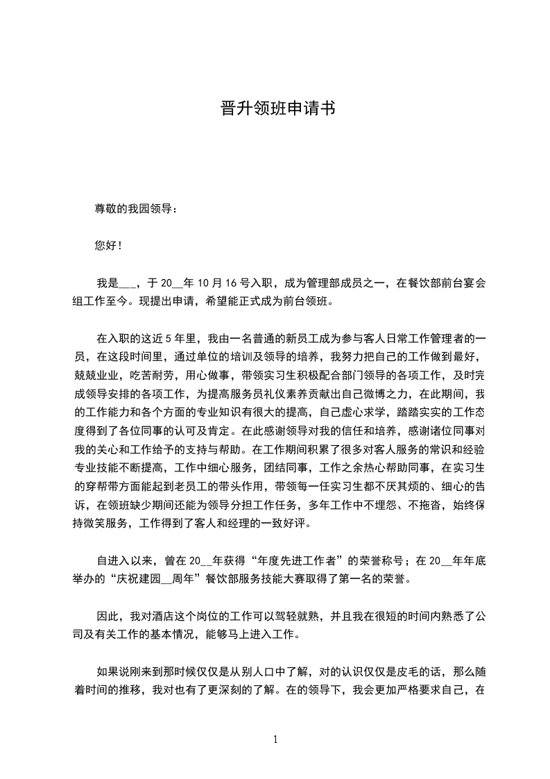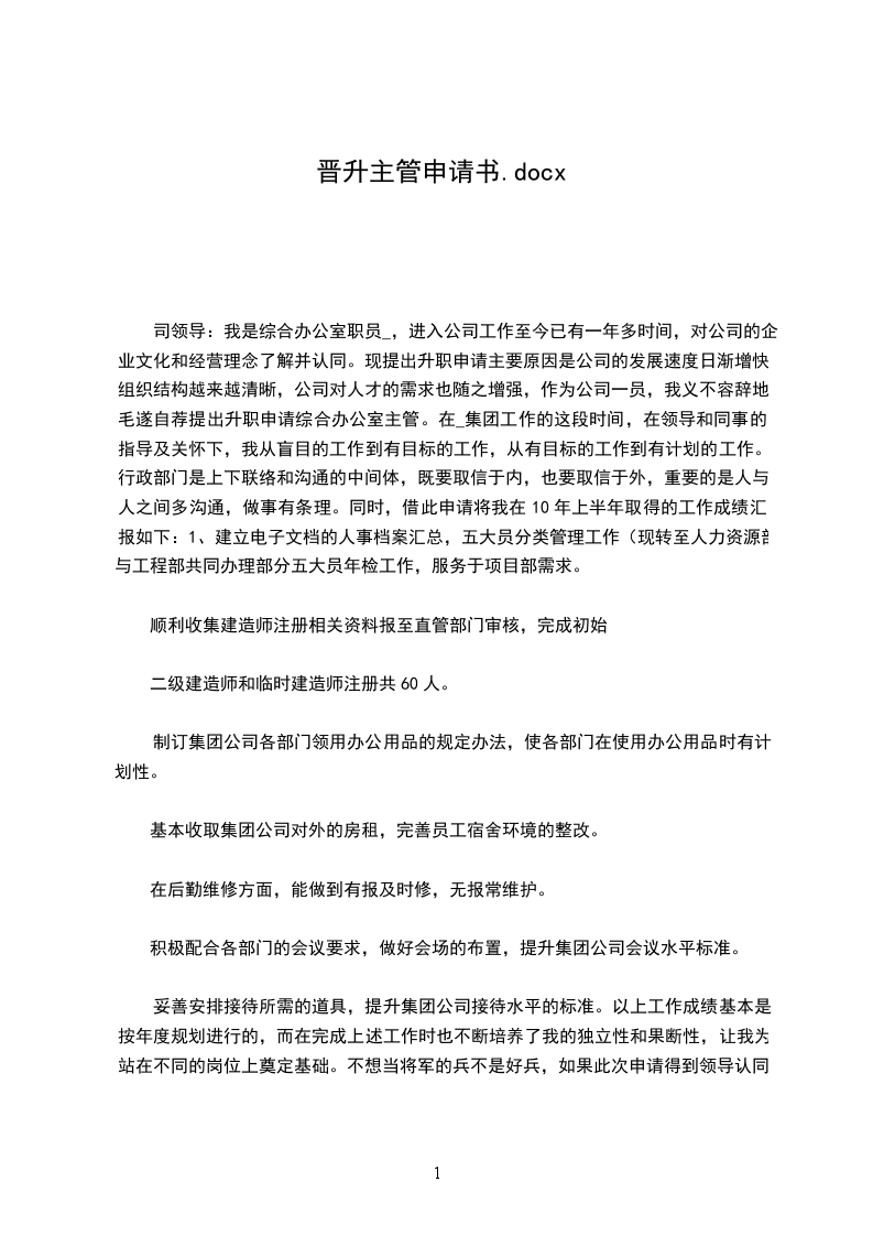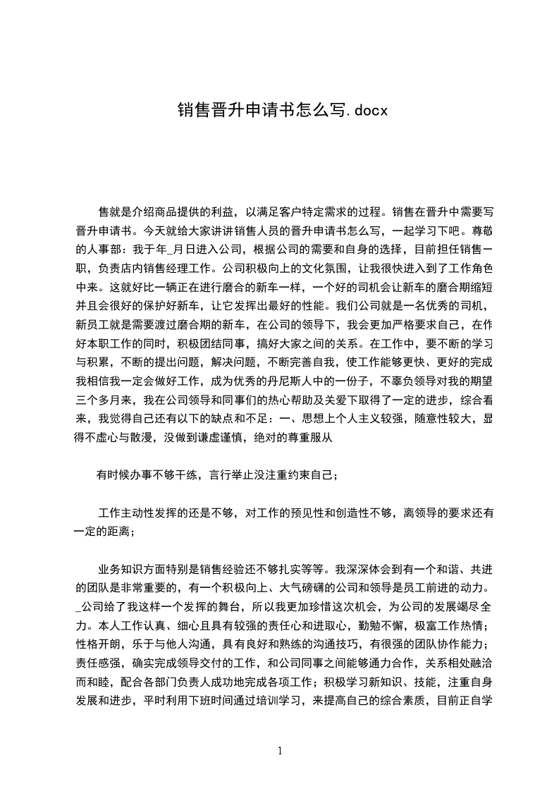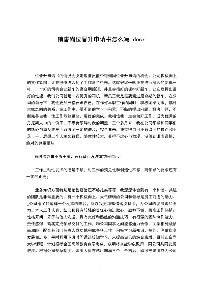 业务知识方面特别是销售经验还不够扎实等等。我深深体会到有一个和谐、共进的团队是非常重要的,有一个积极向上、大气磅礴的公司和领导是员工前进的动力。_公司给了我这样一个发挥的舞台,所以我更加珍惜这次机会,为公司的发展竭尽全力。本人工作认真、细心且具有较强的责任心和进取心,勤勉不懈,极富工作热情;性格开朗,乐于与他人沟通,具有良好和熟练的沟通技巧,有很强的团队协作能力;责任感强,确实完成领导交付的工作,和公司同事之间能够通力合作,关系相处融洽而和睦,配合各部门负责人成功地完成各项工作;积极学习新知识、技能,注重自身发展和进步,平时利用下班时间通过培训学习,来提高自己的综合素质,目前正自学大学课程,计划报考全国高等教育自学考试,以期将来能学以致用,同公司共同发展、进步。根据公司规章制度,试用人员在试用期满三个月合格后,即可被录用成为公司正式员工。因此,我特向经理申请:希望能根据我的工作能力、态度及表现给出合格评价,使我按期转为正式员工,并根据公司的薪金福利情况,从年月日起,转正工资调整为,恳请领导予以批准来到这里工作,我最大的收获莫过于在敬业精神、思想境界,还是在业务素质、工作能力上都得到了很大的进步与提高,也激励我在工作中不断前进与完善我明白了企业的美好明天要靠大家的努力去创造,相信在全体员工的共同努力下,企业的美好明天更辉煌。在今后的工作和学习中,我会进一步更加严格要求自己,虚心向其他领导、同事学习,我相信凭着自己高度的责任心和自信心,一定能够为公司的发展尽自己的微薄之力,我更深信今天我以公司而自豪,明天公司以我而骄傲。此致敬礼!年月日销售晋升申请范文篇2各位公司领导你们好:在这里我以平常人的心态,参与销售员工转正申请。首先应感谢领导为我们创造这次转正申请的机会,经过四个月工作锻炼使自己各方面素质得以提高,几个月的工作使我深深感受到机遇和挑战并存,成功与幸酸同在。参与这次申请,使我在求真务实认识自己,在积极进取中不断追求,在拼搏奉献中实现自己,在市场竞争中完善自己。我深知加入销售部工作十分重要,这主要体现在以下三个方面,一是为企业树立好公司形象做好本职工作,二是为企业促进业务,宣传企业文化,三是为企业回笼资金,当好配角,胸怀全局,当好参谋,服从领导。如果说我申请成功,我的工作思路是以“三个服从”要求自己,以“三个一点”找准工作切入点,以“三个适度”为原则与人相处,我会尽最大的努力去找结合点,我的处事原则和风格是,努力做到严格要求,严密制度,严守纪律,我将用真情和爱心去善待我的每一位同事,使他们的人格得到充分的尊重,相互给我们一个宽松的发展和创造空间,用制度和岗位职责去管理我自己,让我象圆规一样,找准自己的位子,象尺子一样公正无私,象太阳一样给人以温暖,象竹子一样每前进一步,小结一次。我的工作目标是:“以为争先,以为促为”。争取公司领导对销售部的工作给予支持,使我们工作管理制度化,服务优质化,参谋有效化。沟通员工与公司领导之间关系的桥梁,宣传精神文明的窗口,传播企业文化的阵地,培养人才的摇篮,连接企业合作的纽带,我原与大家共创美好的未来,迎接公司辉煌灿烂的明天。望公司领导给予批准为盼。此致敬礼!年月日销售晋升申请范文篇3尊敬的领导:_-_年_月_日我成为_-_公司的试用员工,到今天2个月试用期已满,现申请转为公司正式员工。在岗试用期间,我在销售部学习工作。汽车销售是我以前未曾接触过的,在销售部领导的耐心指导和同事热心帮助下,我很快熟悉了汽车销售的规范操作流程。在销售部的工作中,我一直严格要求自己,认真做好日常工作遇到不懂的问题虚心向同事请教学习,不断提高充实自己,希望能尽早独当一面,为公司做出更大的贡献。当然,刚进入销售部门,业务水平和销售经验上难免会有些不足,在此,我要特地感谢销售部的领导和同事对我的入职指引和悉心的帮助,感谢他们对我工作中提醒和指正。经过这两个月学习,我现在已经能够独立承担一般车辆销售业务,在以后的工作中要不断努力学习以提高自己业务能力,争做一个优秀的汽车销售顾问。这两个月来我学到了很多,感悟了很多,看到公司的迅速发展,我深深地感到骄傲和自豪,也更加迫切的希望以一名正式员工的身份在这里工作,实现自己的奋斗目标,体现自己的人生价值,和公司一起成长。在此我申请转正,恳请领导给我继续锻炼自己、实现理想的机会。我会用饱满的热情做好本职工作,为公司创造更大价值和销售业绩!此致敬礼!年月日5