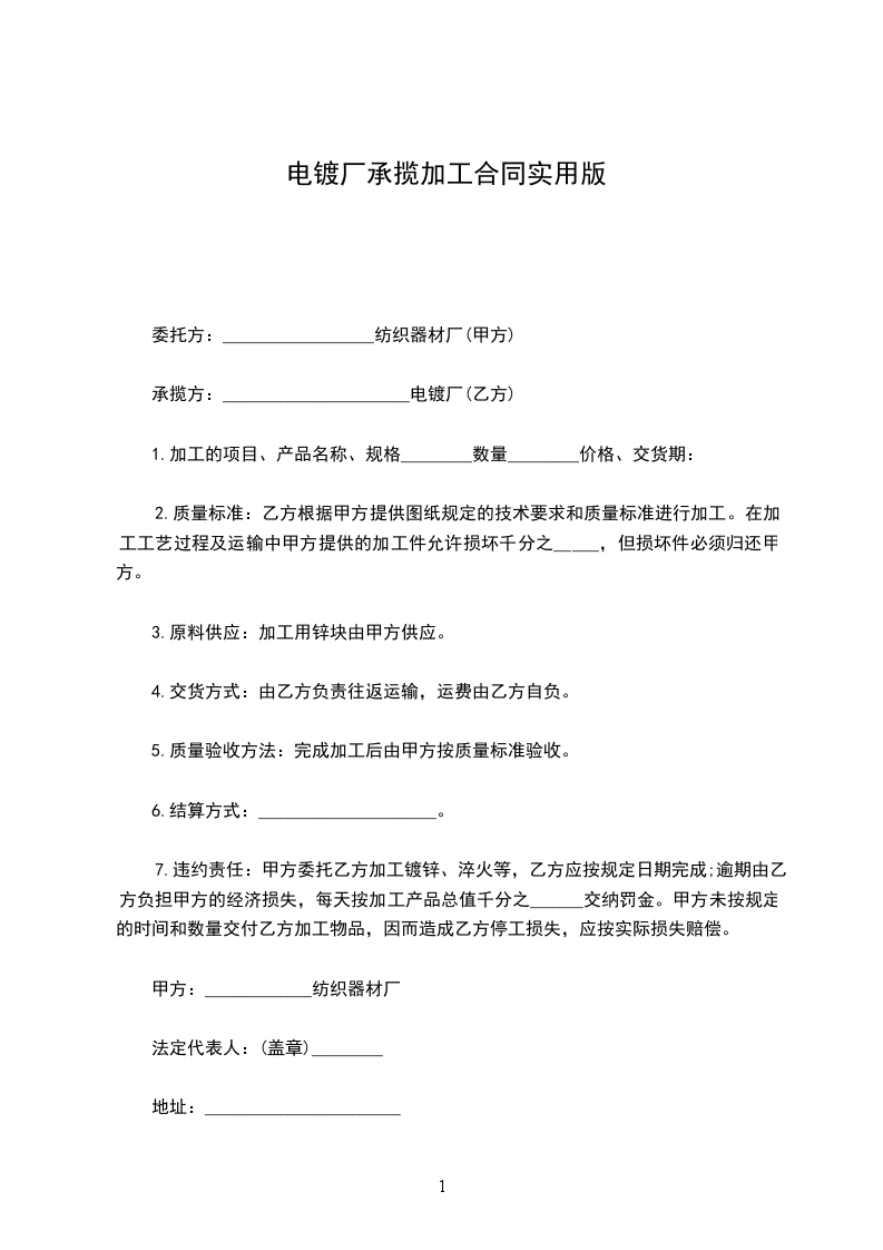 7.违约责任:甲方委托乙方加工镀锌、淬火等,乙方应按规定日期完成;逾期由乙方负担甲方的经济损失,每天按加工产品总值千分之______交纳罚金。甲方未按规定的时间和数量交付乙方加工物品,因而造成乙方停工损失,应按实际损失赔偿。