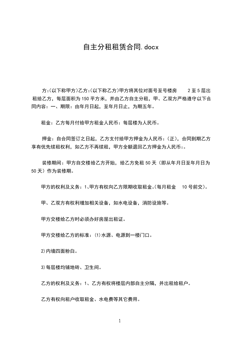 方:(以下称甲方)乙方:(以下称乙方)甲方将其位对面号至号楼房2至5层出租给乙方,每层面积为150平方米,并由乙方自主分租,甲、乙双方严格遵守以下合同内容:一、期限:由年月日起,至年月日止,为期五年。