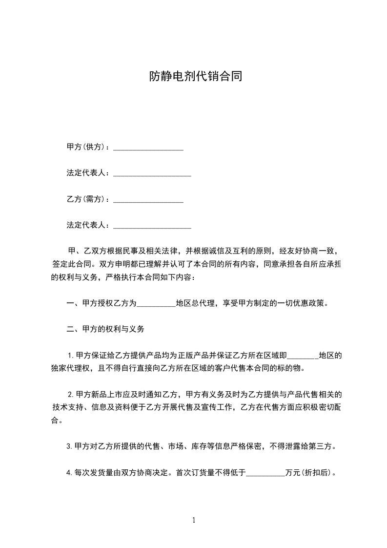 一、甲方授权乙方为__________地区总代理,享受甲方制定的一切优惠政策。
