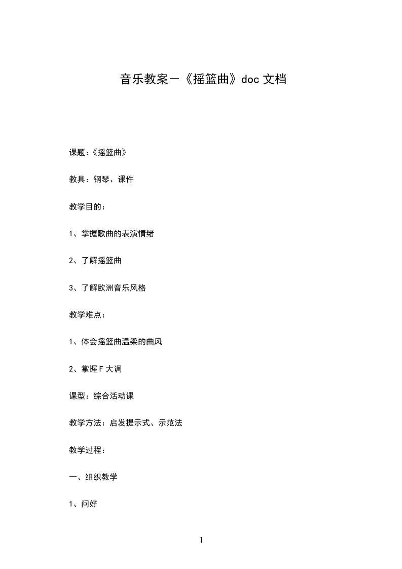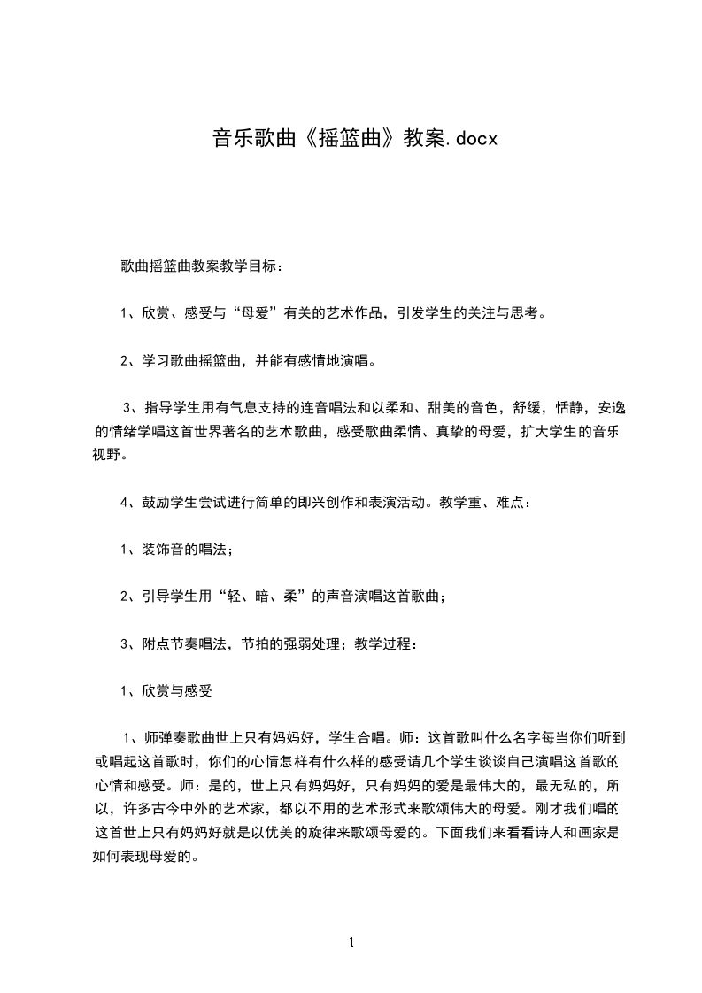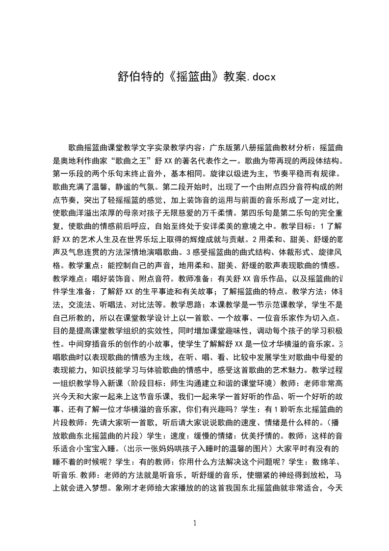 2.2.321|教师:如果用符号来标记句子,为了清楚,人们就用a a1 b a1的形式来标记。2解决歌曲难点:装饰音(运用比较法)教师:这句还有一个地方不太容易唱好听,你们听到范唱中是怎样唱的吗?学生:有个拐弯儿。教师:如果我们不加拐弯儿,我相信大家都能唱准,我们一起来试试看,54325|(指导学生唱)学生:唱不带装饰音的歌谱。教师:现在我加上装饰音来唱,大家感觉到什么?我唱两种,大家听(唱两种都带歌词的),大家感觉哪种演唱更加突出了妈妈对孩子的爱?学生:带装饰音的更能突出母爱的伟大、无私。教师:你们能把这个小拐弯儿,唱得很准确吗?咱们来试一试。学生:唱加装饰音的地方。教师:这个地方唱会了,请大家完整唱歌谱。(伴奏)学生:听琴完整唱歌谱。教师:这样一首短小的歌曲,作曲家在创作时也分了段,大家在学习歌谱过程中,感觉歌曲可以分为几段呢?学生:两段。教师:歌曲在创作上非常短小、精练,在众多的摇篮曲中显得格外突出,成为摇篮曲中的经典。我想不仅是由于歌曲结构的规整,摇篮曲的特点鲜明,而且也因为歌曲中这种伟大的母爱。你们感觉是这样吗?还有补充的吗?3完整唱第一段歌词(运用连贯的气息演唱歌曲)教师:我们先来唱歌曲第一段歌词,看谁能唱得入情入境(伴奏)学生:轻声唱歌曲第一段歌词教师:还可以,歌曲情绪是安静的,优美抒情的,我们在唱时注意歌曲的气息要连贯些。(教师示范怎样运用气息演唱歌曲)学生:坐姿、气息调整,以更积极的状态演唱。4自学歌曲第二、三段歌词(自主学习)教师:我们想唱第二段和第三段歌词吗?学生:很想。教师:我给大家些时间自己先唱一唱,等会儿我们再齐唱。学生:自主学习。教师:大家基本没有问题了,我想听听大家怎样运用气息支持来演唱歌曲(伴奏)学生:演唱第二、三段歌词。教师:妈妈对着睡在梦乡的孩子,愿望世间一切美好的东西都给他(她),你们唱后还有什么想法?学生:我感觉妈妈非常辛苦,希望宝宝快些睡着,妈妈好休息一下。教师:你体会的很深。5音乐家创作这首歌曲的经历(引发学生兴趣)教师:当时的舒XX是在什么情况下创作出来这首歌曲的呢?原来这首歌曲与一盘土豆有关,舒XX有一天漫步在街头,感觉很饿,不自觉的走进一家餐厅,却发现自己身无分文,想找个熟人,也没有。正在这个时候,他发现了报纸上刊登着的一首诗,就是这首有克劳谛乌斯写的诗,于是他就叫侍从招来笔和纸,很快谱了曲。就是这首摇篮曲,于是作曲家就用这首歌曲,换取了一盘土豆,解决了肚子问题。他去世30年后,这个作品卖到了30万法郎。学生:惊叹。教师:他一生创作了14部歌剧、9部交响曲、100多首合唱曲、567首歌曲,他的朋友说,他把看到的都写成了歌,有时候,一个早晨就写5-6首。而且大部分歌曲成为经典作品,还有些作品,在民间广为传唱。由于他丰富的创作,所以人们也称他为“歌曲之王。”6完整演唱歌曲(充满感情的演唱歌曲)教师:现在我们请大家再来完整的演唱歌曲,要求气息支持、充满感情的演唱学生:在教师的伴奏中进行演唱。三知识拓展(阶段目标:了解作家的其他作品)1欣赏其他演唱形式的摇篮曲教师:人们处于对他作品的喜爱,这首享誉中外的摇篮曲被编为各种演唱形式,请大家听根据这首歌曲改编的合唱。学生:观看童声合唱视频摇篮曲。教师:改编后的歌曲,更加突出了母爱无私的爱,大家学了歌曲之后,不仅学会唱,而且学着理解、热爱自己的母亲。另外他的另一首作品小夜曲也是非常有名的。教师范唱其中的片段。学生:聆听歌曲小夜曲片段,我们曾经在某地听过.2进一步了解作曲家的艺术生平教师:舒XX的一生是短暂的,但又是辉煌的,他的很多作品流传至今,请大家看下面这段介绍。(播放影音资料)学生:观看资料片。四教学检测(阶段目标:教学反馈)教师:大家今天有哪些收获?学生:故事好听、歌曲好听、知道了谁是歌曲之王等教师:以后有时间我们再给大家介绍他的其他作品,好吗?教师小结: